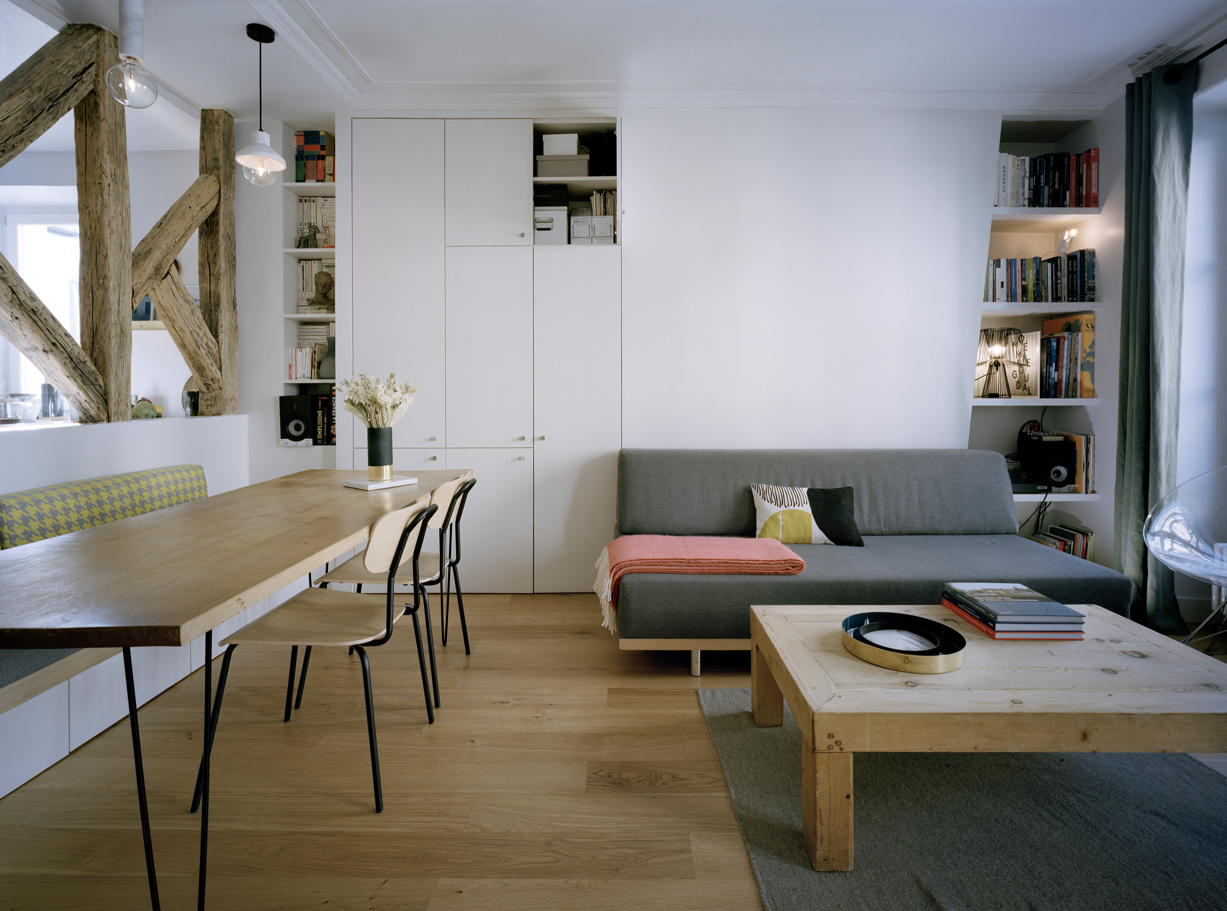 Il fallait à tout prix que cette rénovation intégrale aille vite. Ce couple de trentenaires venait d’acquérir un deux-pièces de 50 m² entre le Canal Saint-Martin et l’hôpital Saint-Louis, leur premier achat immobilier, et leur impératif était de pouvoir investir les lieux deux mois après. Mis en relation par des amis avec l’architecte Nicolas Bossard, celui-ci a su relever le défi dans les temps : « Ils ont emménagé 15 jours avant la fin des travaux. Il ne restait plus que des finitions », nous a-t-il confié à l’occasion de la visite des lieux. Le plus beau est qu’il a néanmoins eu le temps d’étudier le projet pour l’optimiser et le rénover de fond en comble, en le modernisant sans gommer caractère historique, le tout pour 1000 euros/m². Un challenge tout à fait hors du commun que nous avons hâte de découvrir.