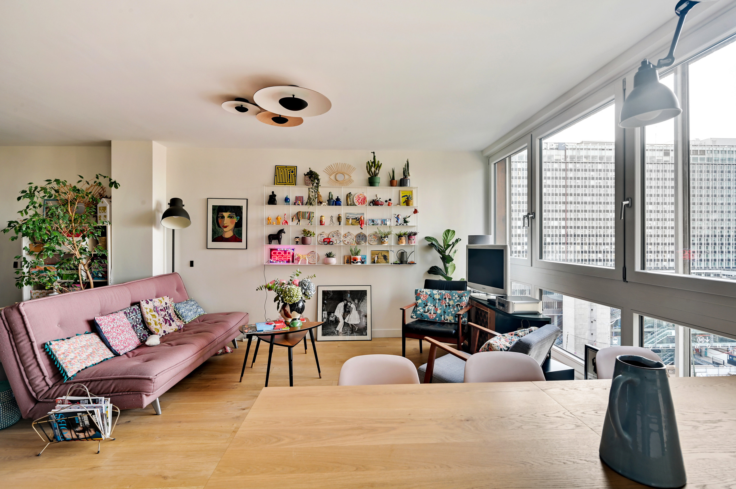 Après. Le séjour a désormais trouvé sa place devant les fenêtres pour profiter pleinement de la luminosité. Cet espace cosy mise sur une décoration éclectique en associant un canapé rose habillé de coussins multicolores et une étagère murale accueillant souvenirs et objets de décoration. Un triple plafonnier au design graphique apporte du caractère à cette zone baignée de lumière.