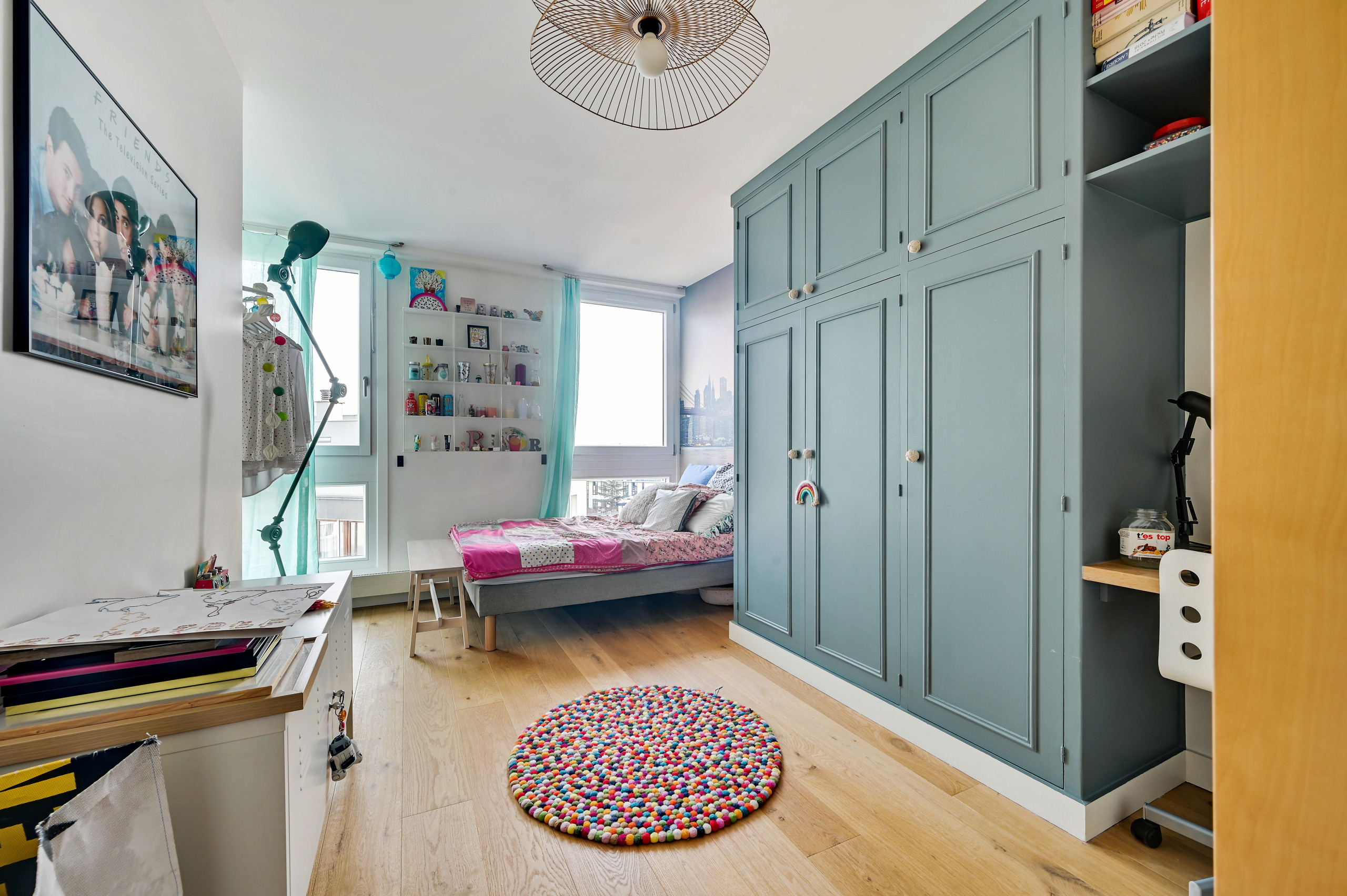 Dans cette chambre d’enfant située à l’étage, le grand placard toute hauteur existant a été modernisé avec une teinte vert-de-gris qui apporte de la douceur à cette pièce, associé à quelques éléments de décoration aux couleurs vives.