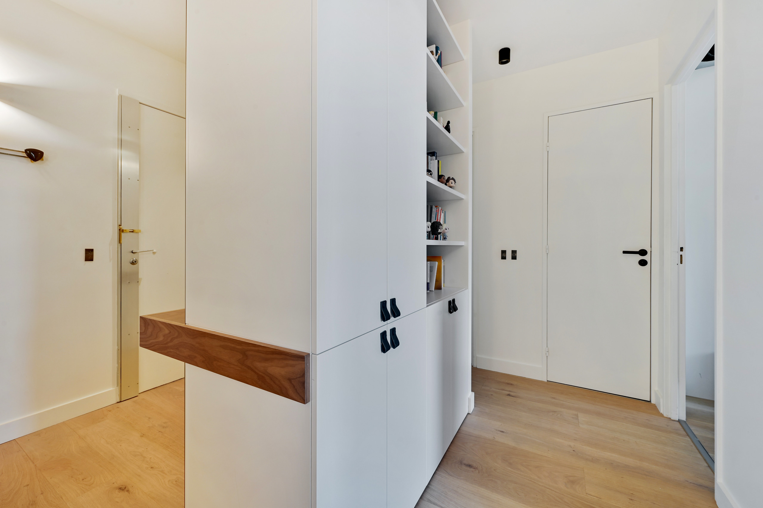D’un côté, une grande penderie a été intégrée; de l’autre, une console en noyer et un miroir teinté font face à une série de patères.