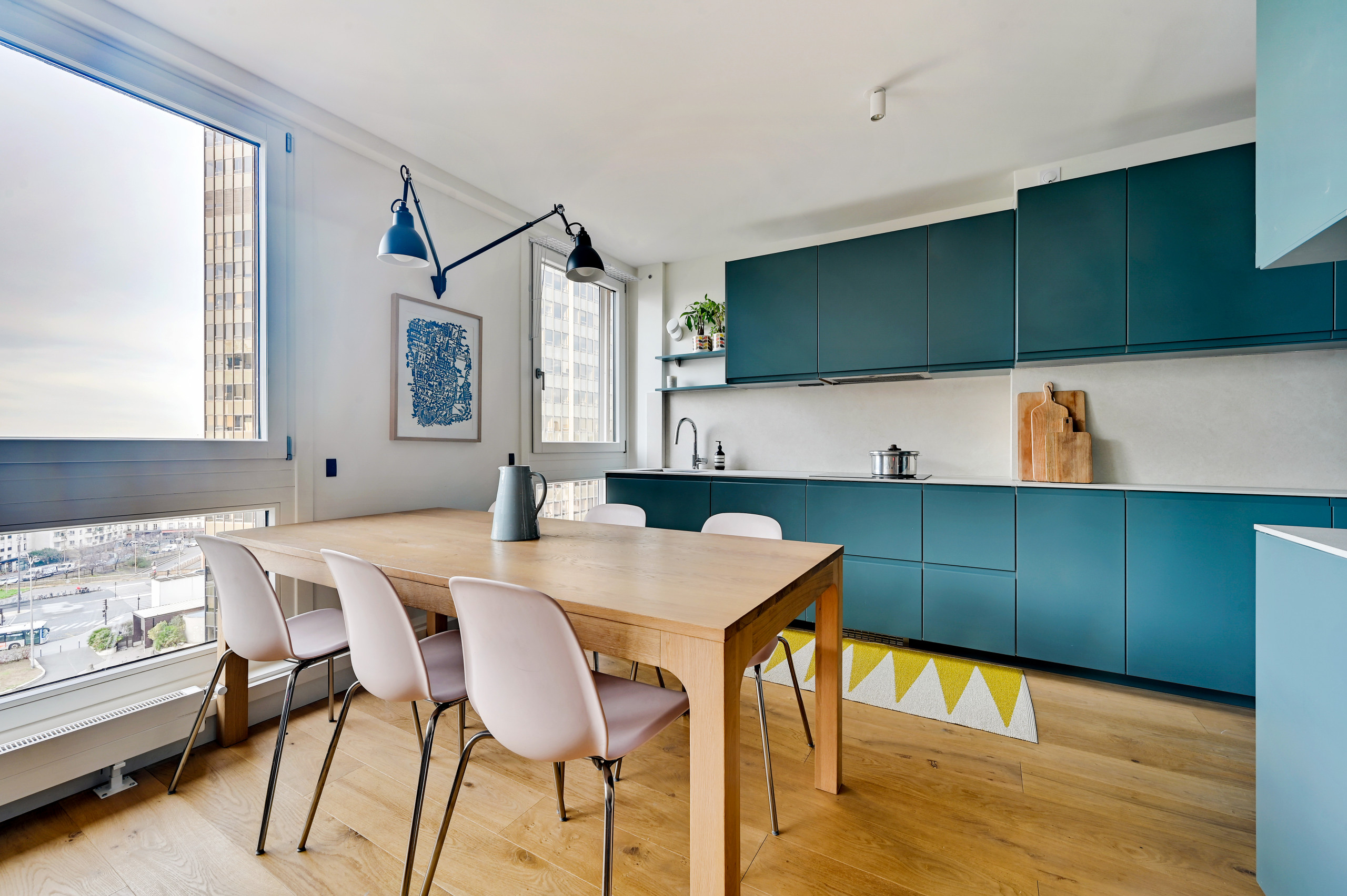 Caissons : Ikea ; Façades : Plum Kitchen ; Plan de travail : Laminam ; Table : AM.PM ; Lampe : DCW Edition