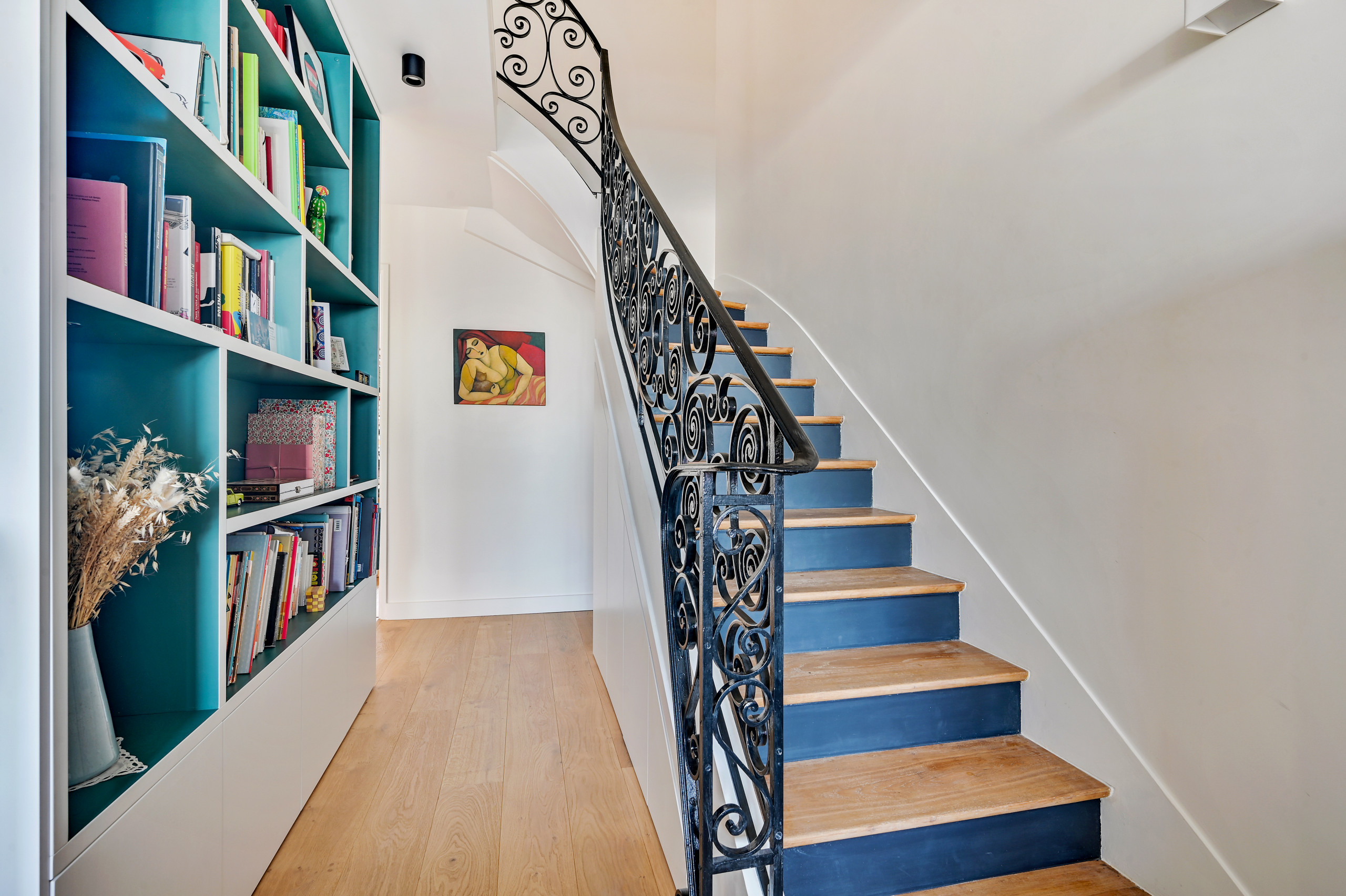 Après. L’escalier d’origine a été restauré tandis que la rampe en fer forgé, pièce maîtresse des lieux, a été conservée. La moquette a été supprimée pour ne garder que les marches en bois, qui ont été poncées et huilées. Les contremarches ont quant à elles été peintes dans un coloris noir bleuté. « Nous avons pris le parti de peindre les contremarches dans une teinte sombre pour faire ressortir les marches en bois clair, et créer un mix harmonieux avec le fer forgé », précise l’architecte d’intérieur.