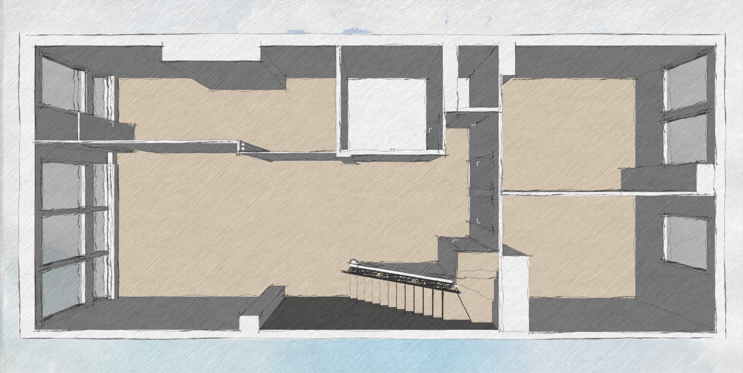 Avant. On accède à l’étage inférieur par l’escalier de l’entrée. Ici, tout a été déposé pour créer un espace adapté aux nouveaux propriétaires, qui répond parfaitement à leur besoins.