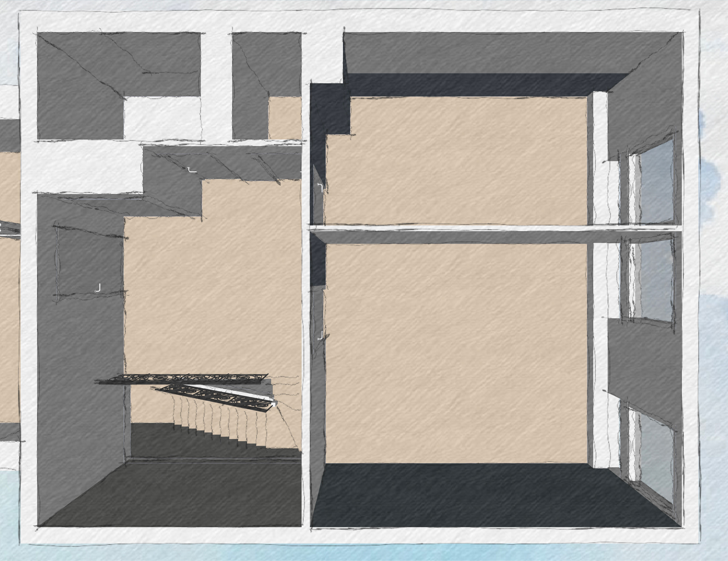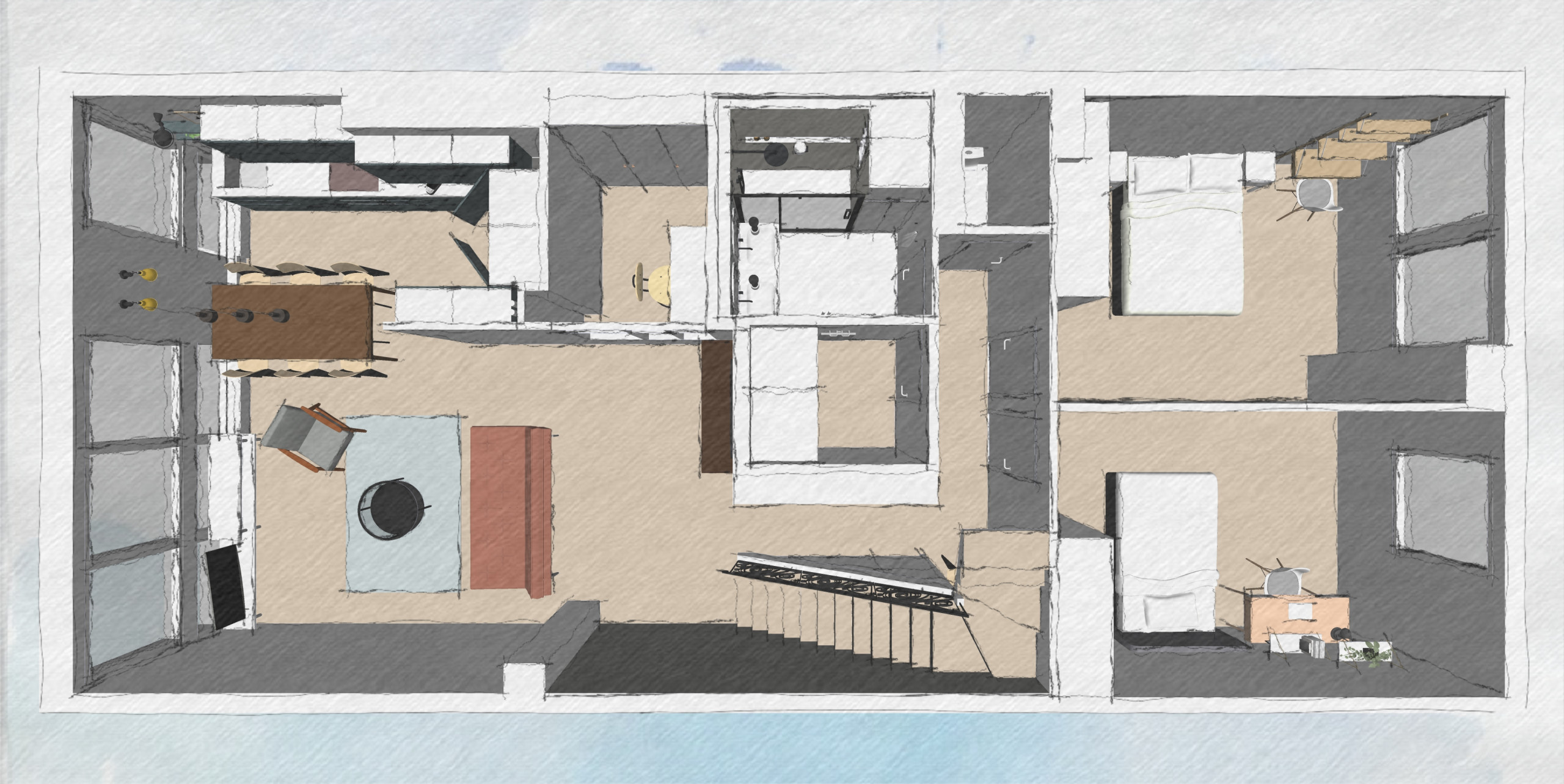 Avant. L’entrée dans l’appartement se fait à l’étage supérieur du duplex, où se trouvent aussi deux chambres et une salle de bains. Si la fonction des pièces n’a pas changé, les cloisons ont été déplacées pour une meilleure optimisation des espaces.