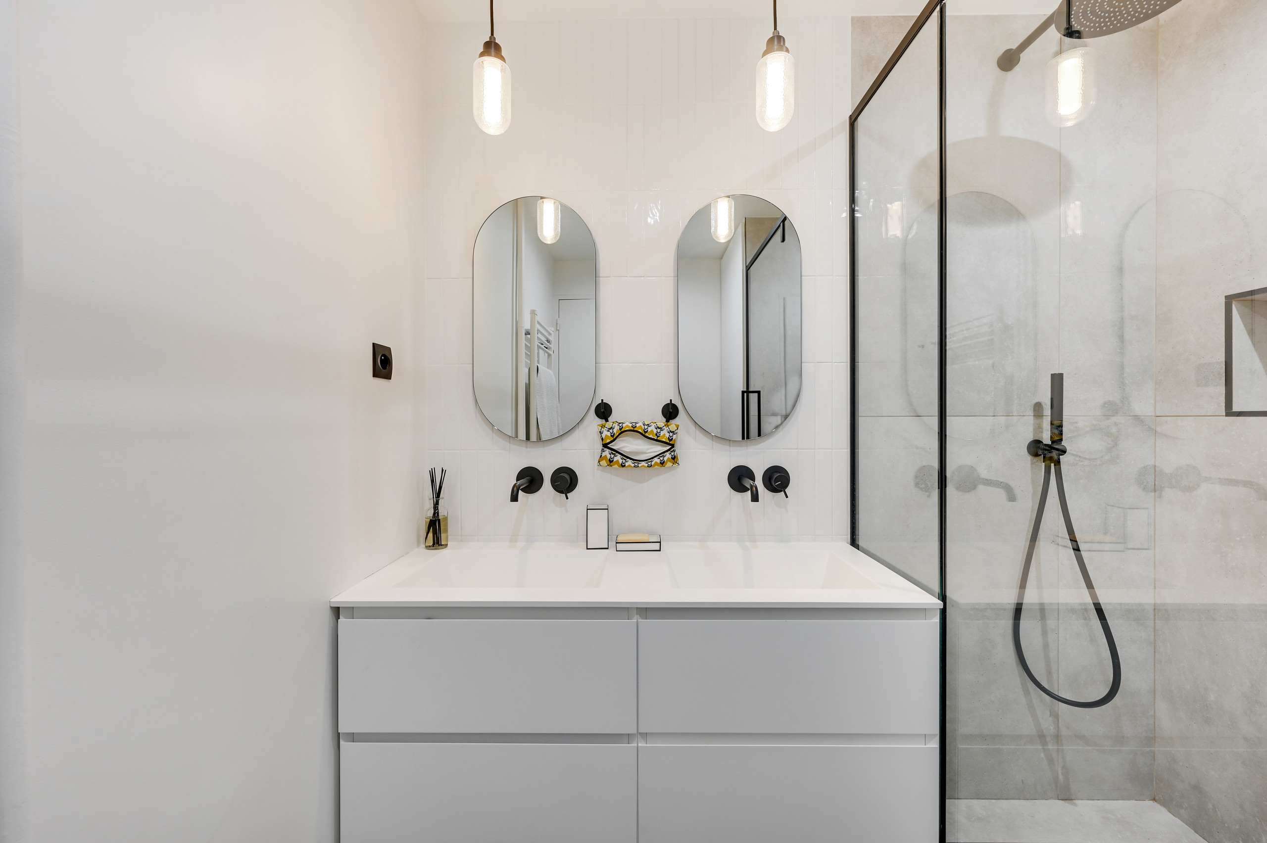 Après. Les propriétaires des lieux ont opté pour une salle de bains familiale à l’ambiance minimaliste déclinée en black & white. Le meuble vasque a été réalisé sur mesure pour pouvoir s’intégrer parfaitement dans cet espace, tout comme les placards toute hauteur qui s’intègrent dans la continuité de la douche.
