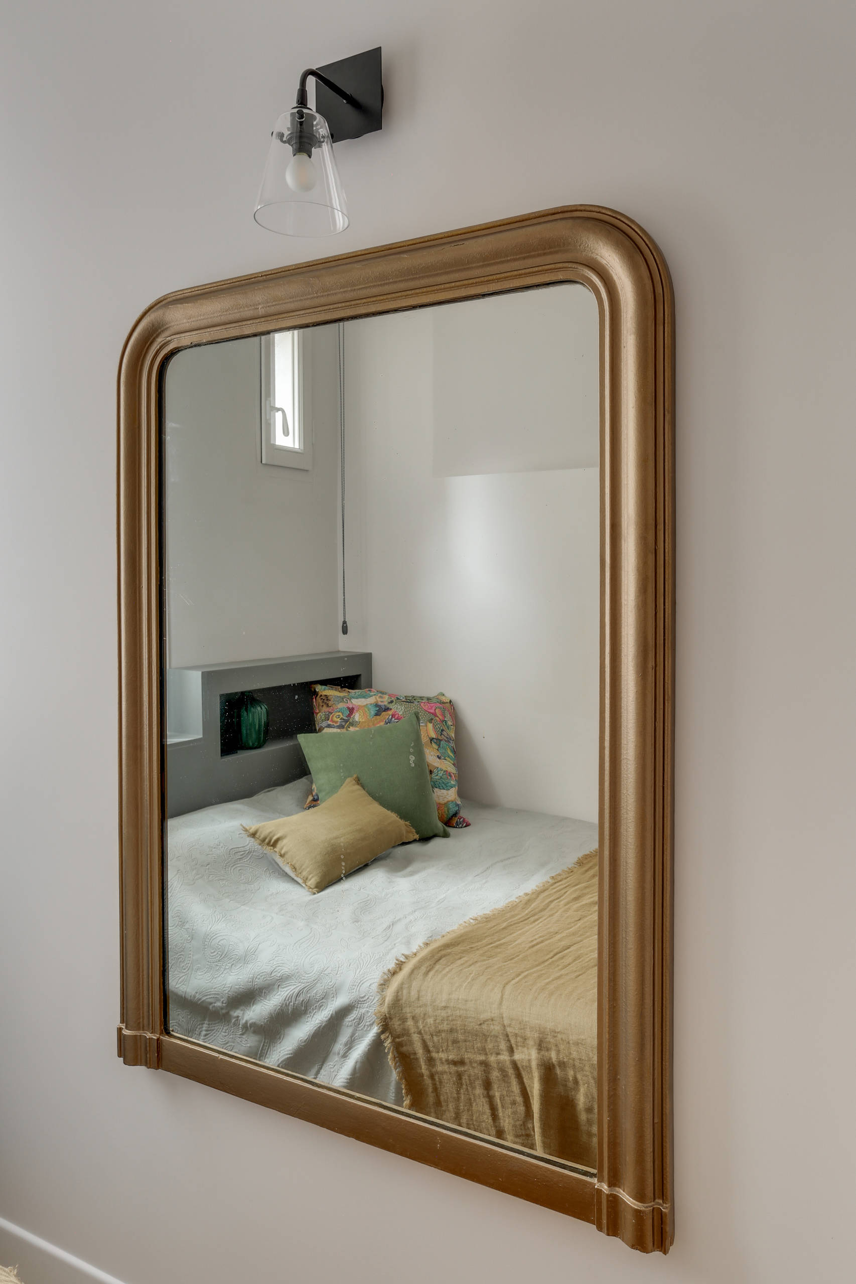 Ainsi, la chambre aux tonalités gris anthracite et rosé léger, occupant l’espace de l’ancienne cuisine, jouit elle aussi de davantage de lumière. Et la petite « meurtrière » de gauche, autrefois enfermée dans un placard de cuisine, a même été révélée. Si l’espace demeure exigu, il a le mérite d’offrir une chambre séparée aux occupants. Ultra-optimisée, elle se compose d’un lit de 140 x 190 cm, d’une tête de lit sur mesure avec des niches très pratiques, munies de prises et spots – à la place d’un ancien garde-manger. Face au miroir, le mur arrondi est percé par une fenêtre en verre armé, située en hauteur, laissant passer la lumière dans les toilettes situés derrière.
