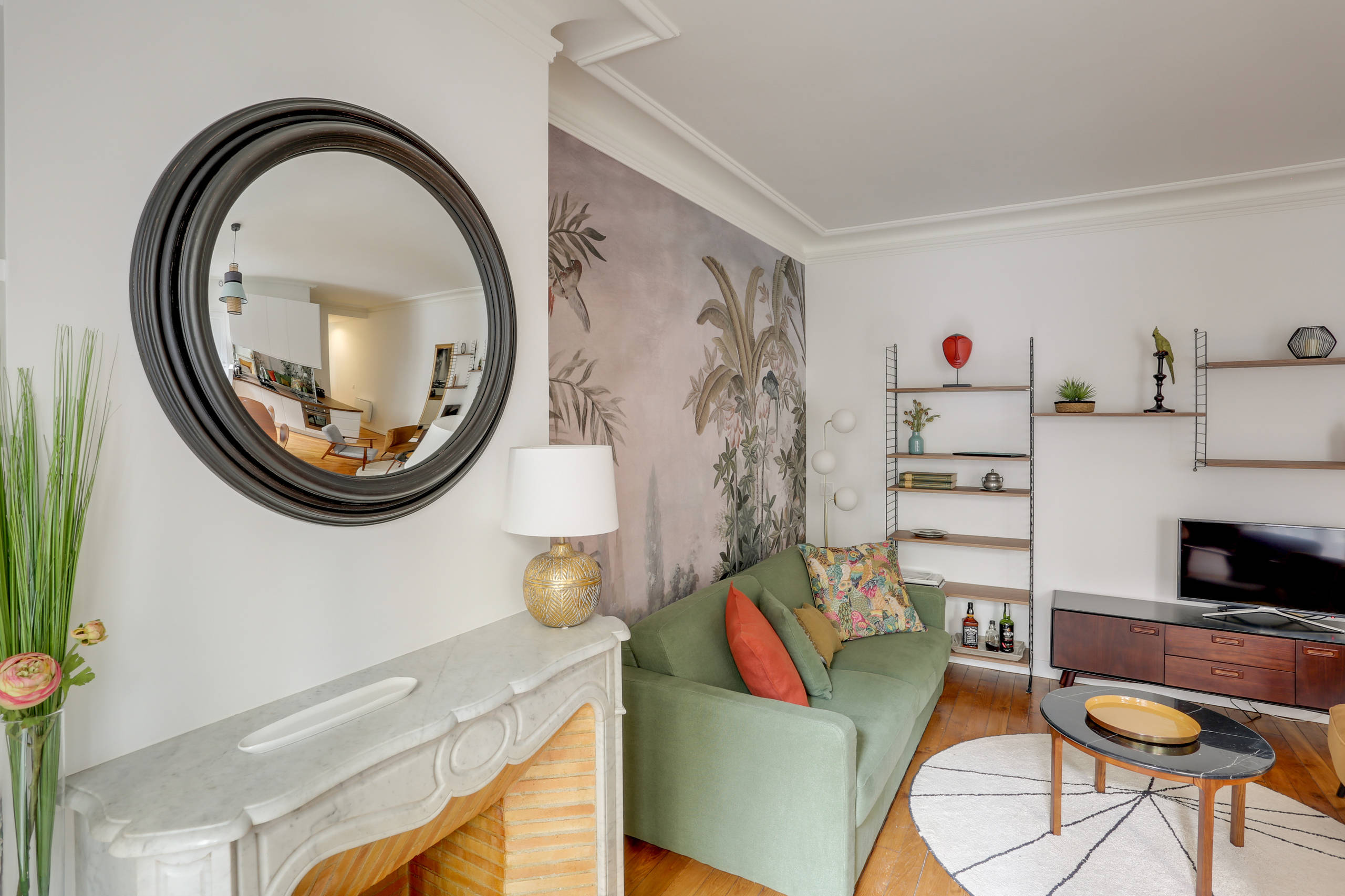 En gardant les moulures — avec quelques raccords supplémentaires —, la cheminée d’époque, et en rénovant le parquet d’origine, Aurore a conservé l’âme de cet intérieur, qui évolue à présent dans une ambiance vintage et de voyage. Le blanc a été privilégié sur les murs, car le choix du papier peint était déjà un parti pris déco fort, tout comme les touches colorées des accessoires.