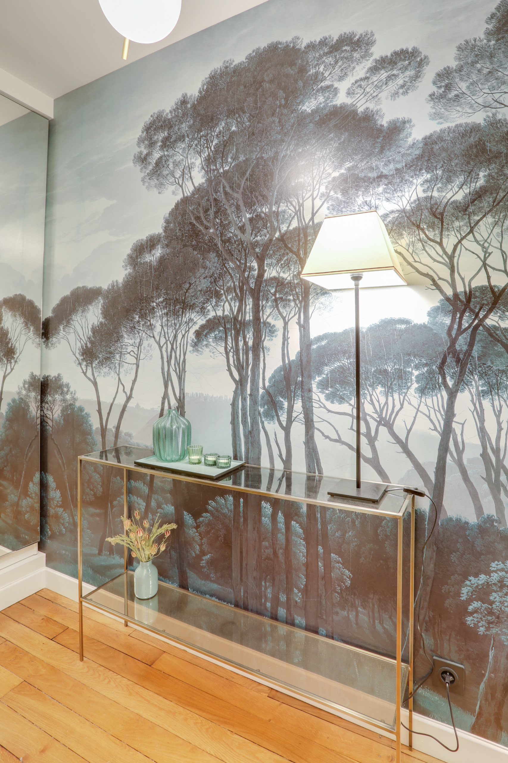 Après. Aujourd’hui, le papier peint végétal panoramique, qui rappelle celui du salon, et les portes des placards en miroir agrandissent visuellement l’espace. « L’idée était d’arriver dans un univers singulier et de perdre ses repères », s’amuse l’architecte d’intérieur.