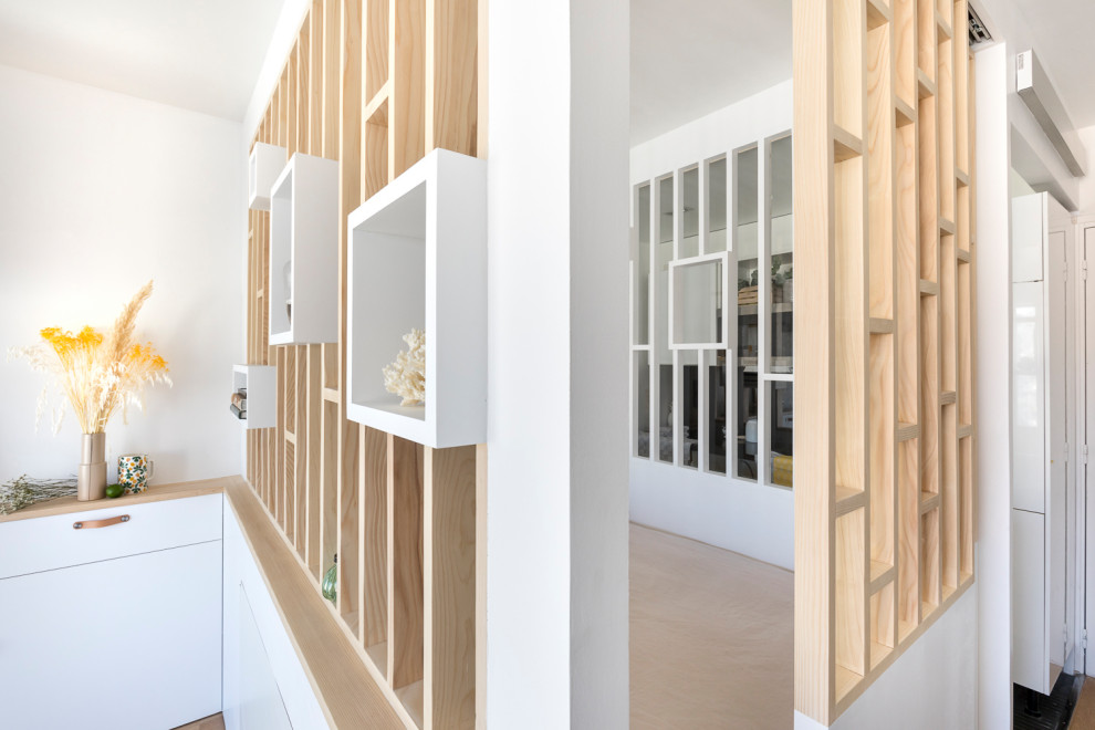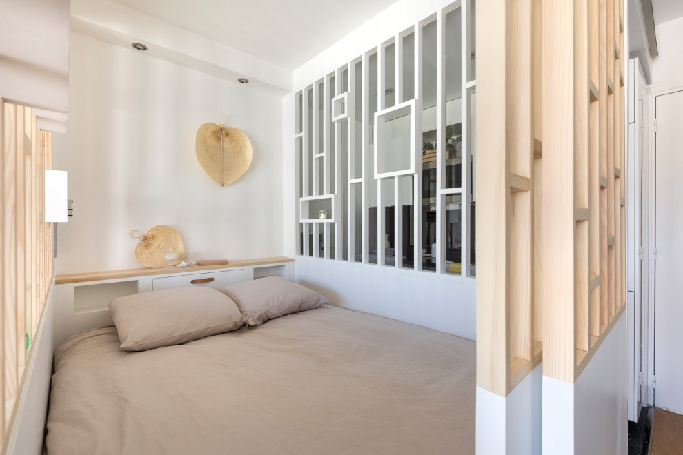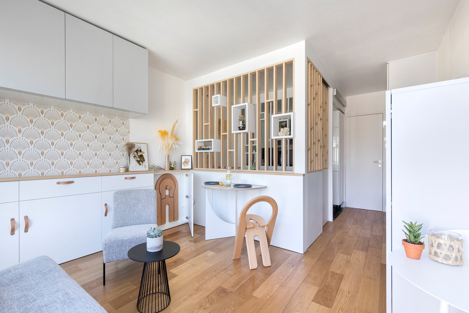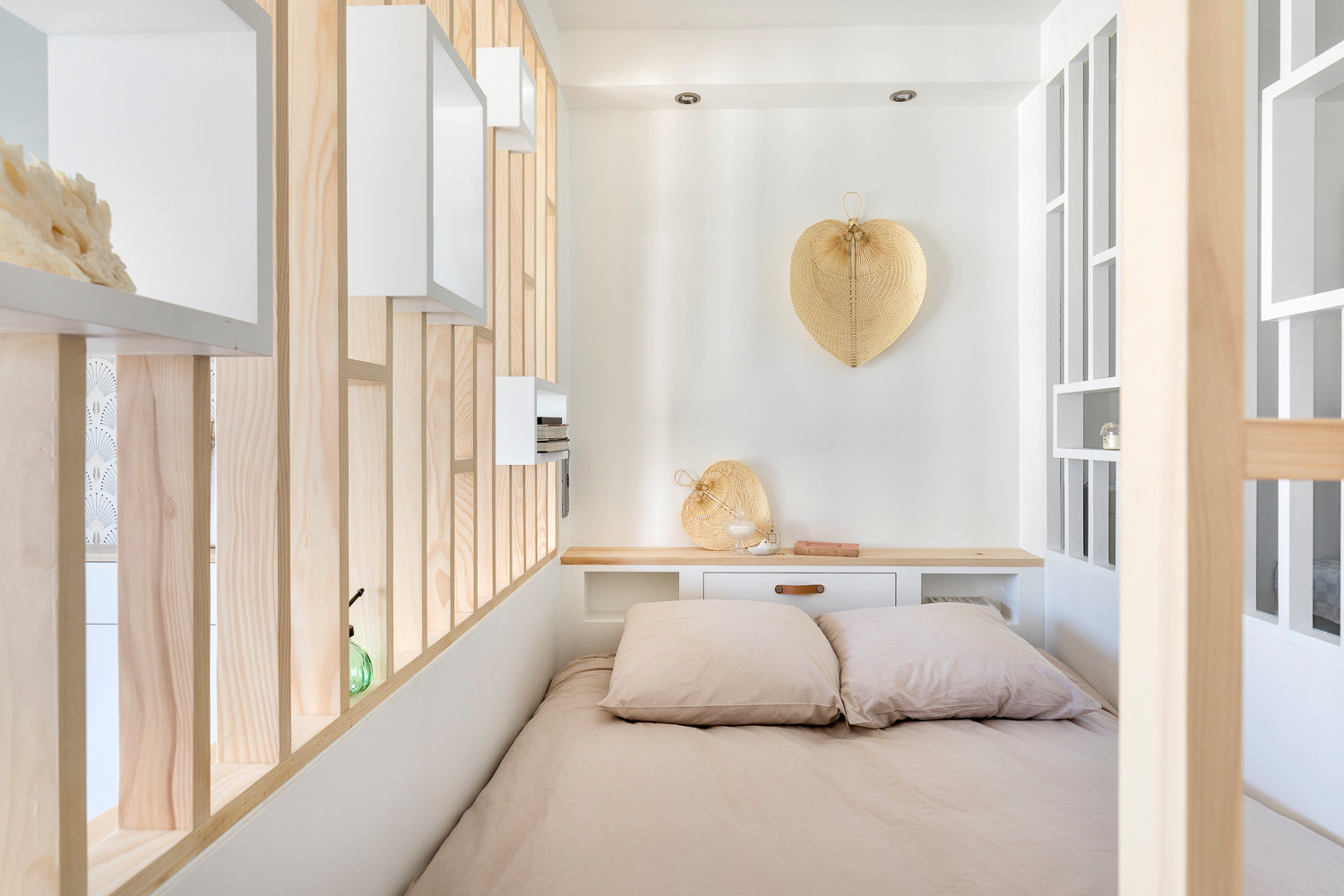 Vu du séjour, le coin nuit avec son claustra ajouré rayonne tel le bijou de l’appartement : « C’est pour cela que nous avons par ailleurs choisi des couleurs claires et neutres, du blanc et du gris pâle. Nous voulions laisser la part belle au bois et au graphisme de la menuiserie », insiste la pro.
