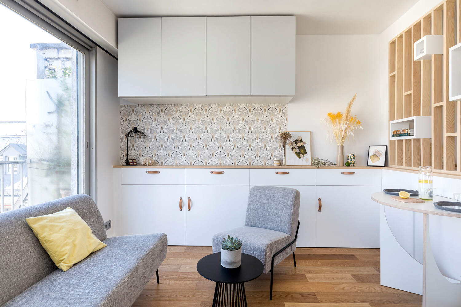« La cuisine n’était pas une pièce essentielle pour la propriétaire. La plupart du temps elle n’y fait que passer pour se faire un café ou réchauffer un plat. Nous avons néanmoins placé une plaque de verre le long du claustra côté cuisine pour éviter les graisses et les odeurs », détaille la pro.