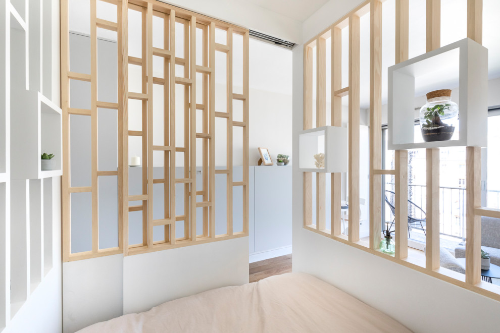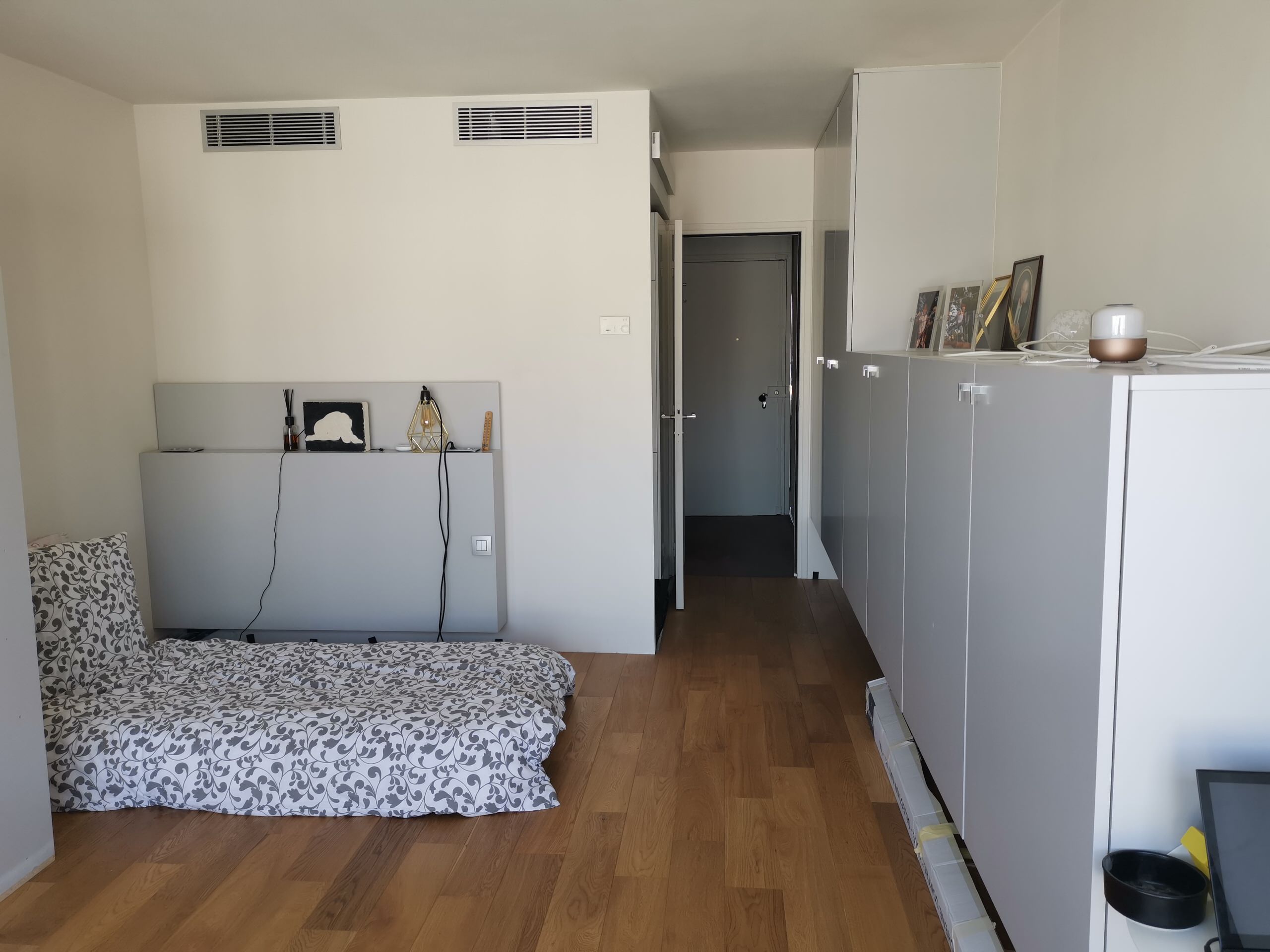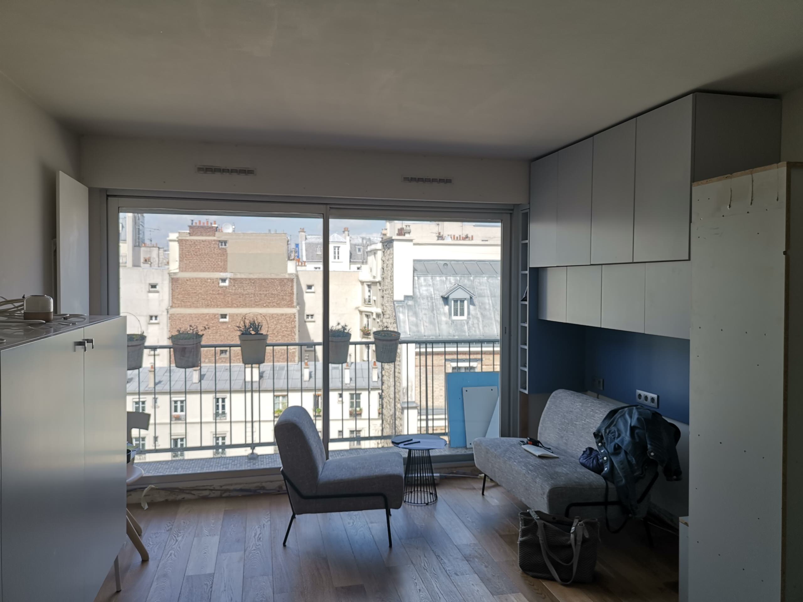Avant. Au septième étage d’un immeuble récent, le studio de 30 m² était en bon état général au moment de l’achat. Aménagé rationnellement, il disposait de pièces d’eau cloisonnées à l’entrée et d’une pièce de vie de 20 m² ouvrant sur une vue dégagée, prolongée par un balcon filant. Plusieurs placards de bonne facture, réalisés sur mesure, se trouvaient déjà dans le logement.