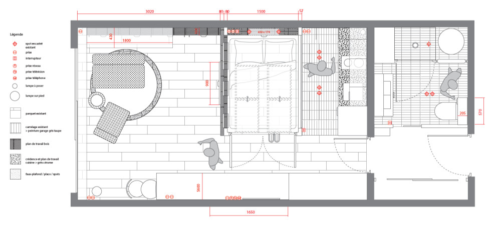Depuis qu’elle le possédait, la propriétaire avait simplement fait poser un parquet en chêne contrecollé, à même lequel elle avait installé son matelas pour dormir. Côté salon, elle avait acquis en outre une banquette et un fauteuil. Mais quand celle-ci prend la décision d’aller vivre dans le studio au quotidien, elle se lasse vite de ces « aménagements d’étudiant ». Elle compte bien muer le pied à terre en cocon chaleureux et accueillant.