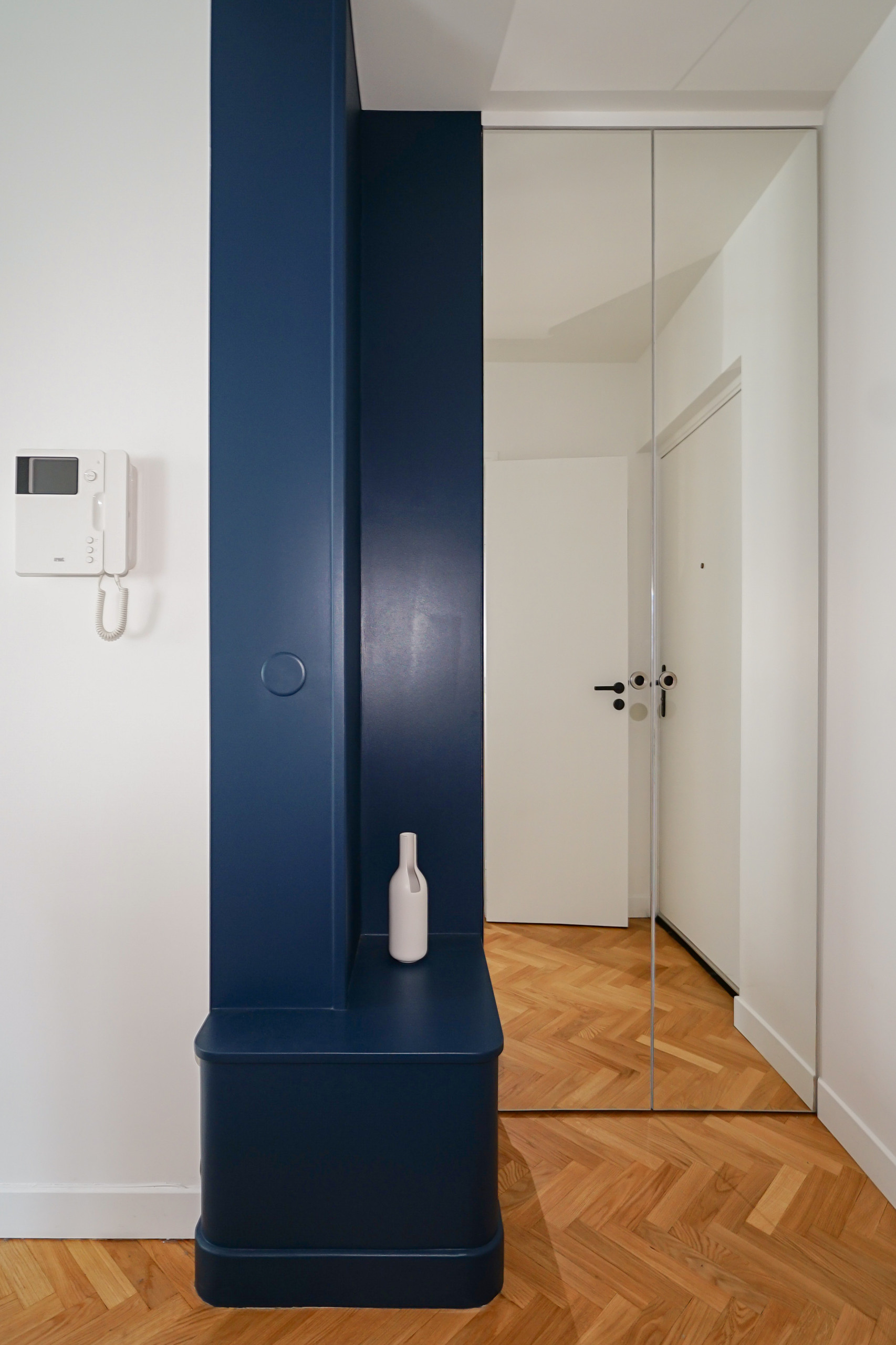 Bien que petite, l’entrée a été équipée de tous les éléments qui font le succès d’un sas bien pensé : nombreux rangements, banquette, niche vide-poches et miroir. « Nous avons réagencé l’entrée en prolongeant le placard d’origine par un autre placard en retour, qui se transforme en banquette-coffre. Ce retour a été peint en bleu Tollens Aïkido afin de redessiner l’espace. Nous avons concentré ici tout le volume de stockage de l’appartement, avec une partie dressing et un espace dédié à la table à repasser et l’aspirateur, ce qui nous a permis d’épurer par ailleurs les espaces de vie, selon le souhait de mes clients », explique l’architecte d’intérieur.