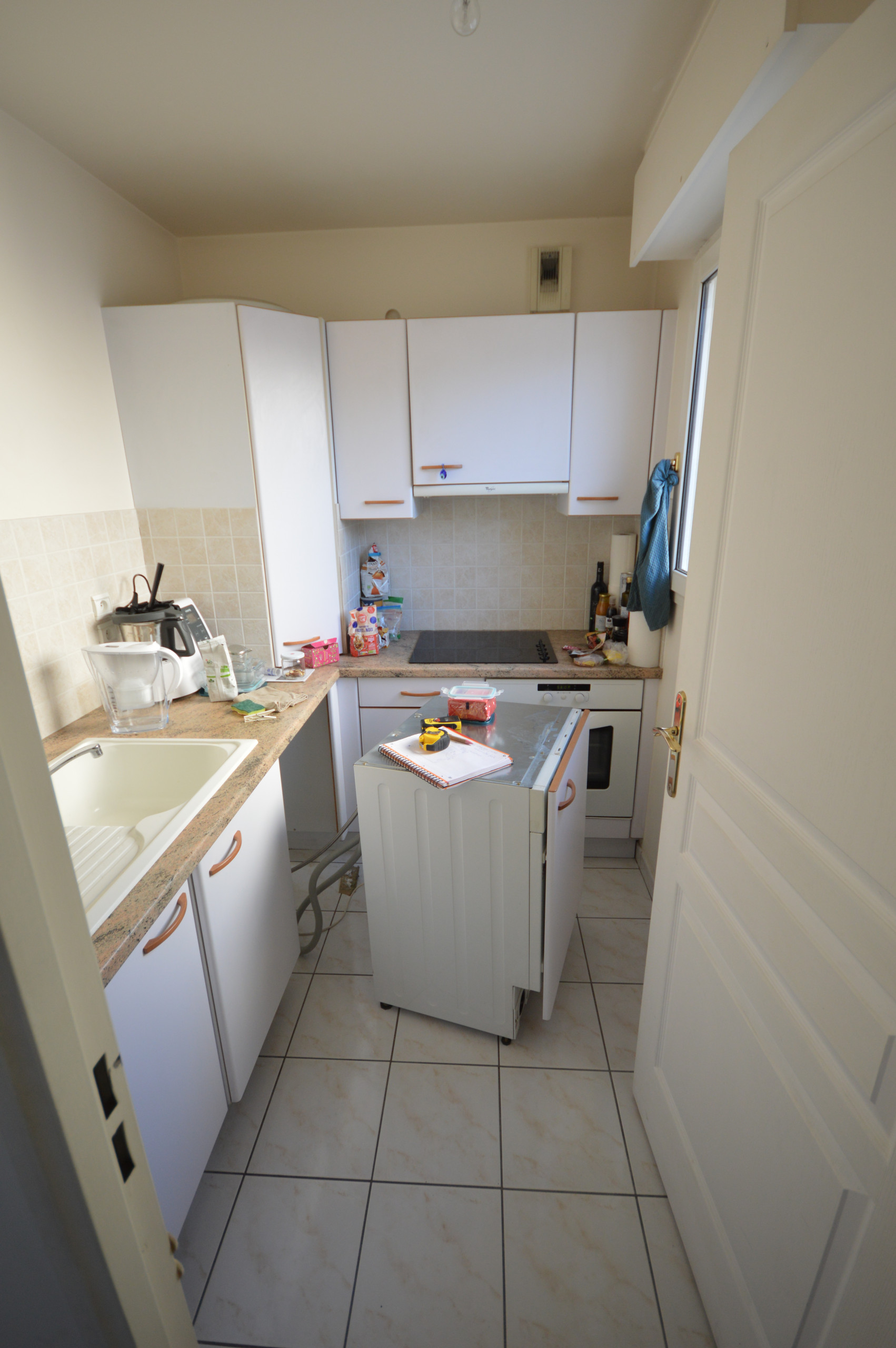 Malgré ses 2,12 mètres de largeur seulement, la cuisine est parfaitement équipée : « Un évier avec, en dessous, du rangement pour les produits et la poubelle, suivi d’un lave-vaisselle de 45 centimètres, puis deux tiroirs de rangement dont un à l’anglaise pour les couverts. Sur la droite, une colonne Ikea a été entièrement adaptée sur mesure pour accueillir un réfrigérateur de 100 centimètres de haut, un four et des rangements », détaille-t-elle.