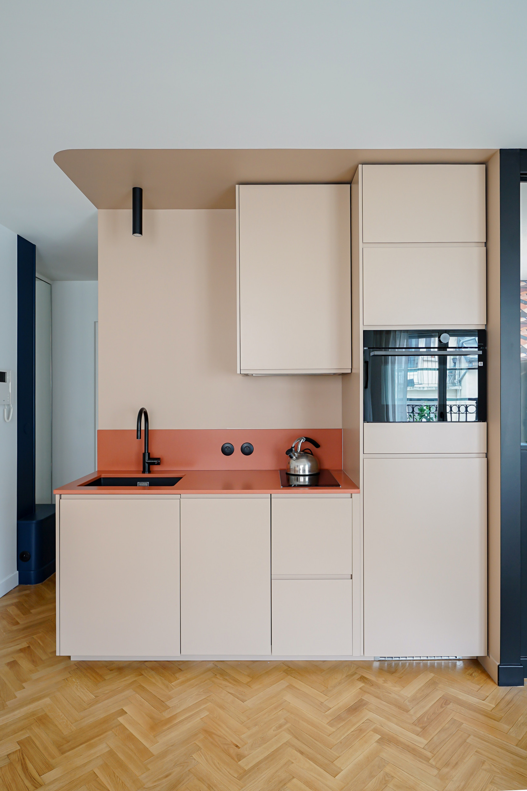 Après. La nouvelle cuisine a été installée au dos de la salle de bains réduite, sans empiéter sur la pièce de vie. Aurore souhaitait en faire un petit bijou discret qui ne dominerait pas visuellement l’espace principal. Pour cela, elle a employé une astuce bien connue des pros : le traitement en color block.
