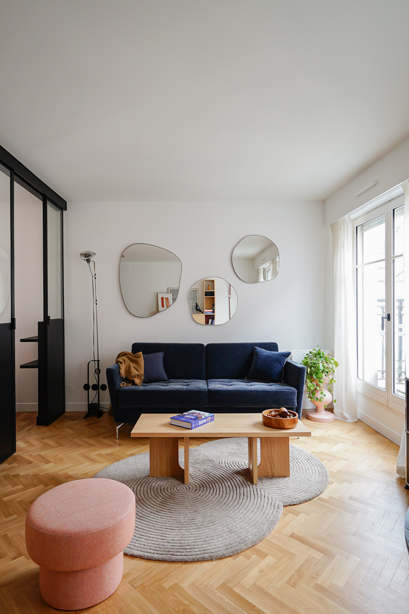 Après. Le canapé a été mis en valeur avec trois miroirs aux formes organiques (Ornica chez La Redoute Intérieurs). Le thème des arrondis se retrouve dans le tapis et le pouf Madura, ce dernier ramenant également une touche orange brûlé proche de celle du plan de travail, l’une des couleurs figurant dans le papier peint du coin nuit.