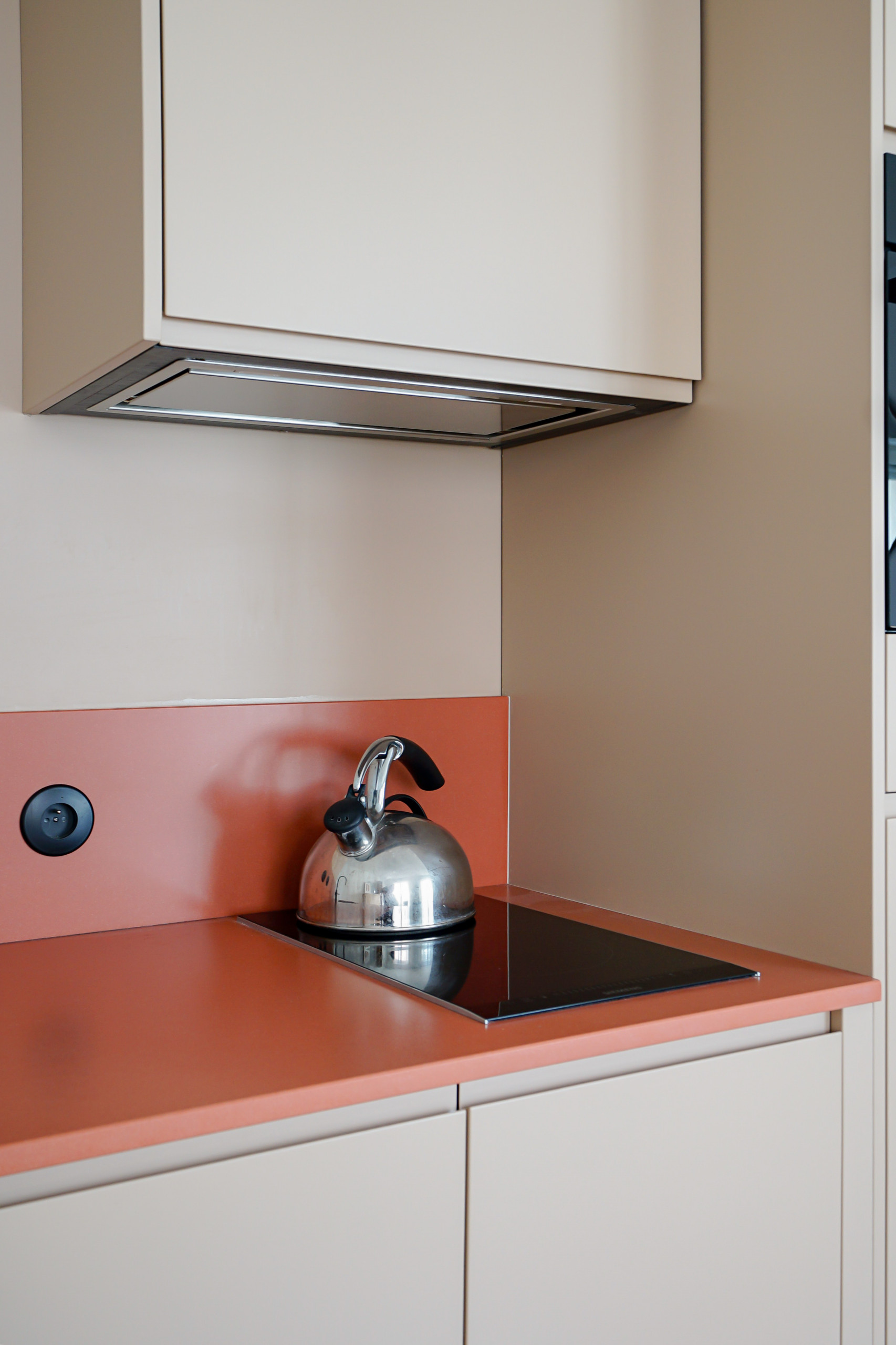 L’électroménager, à l’instar des matériaux, a été choisi dans un registre haut de gamme : un réfrigérateur Siemens et un four combiné Samsung, assurant à la fois les fonctions chaleur tournante et micro-ondes dans un format compact de 45 centimètres de hauteur. Au-dessus du domino de cuisson, on trouve même un groupe d’aspiration Falmec – une marque italienne reconnue pour la qualité de ses hottes et la réduction du bruit –, complété par des rangements en partie haute.