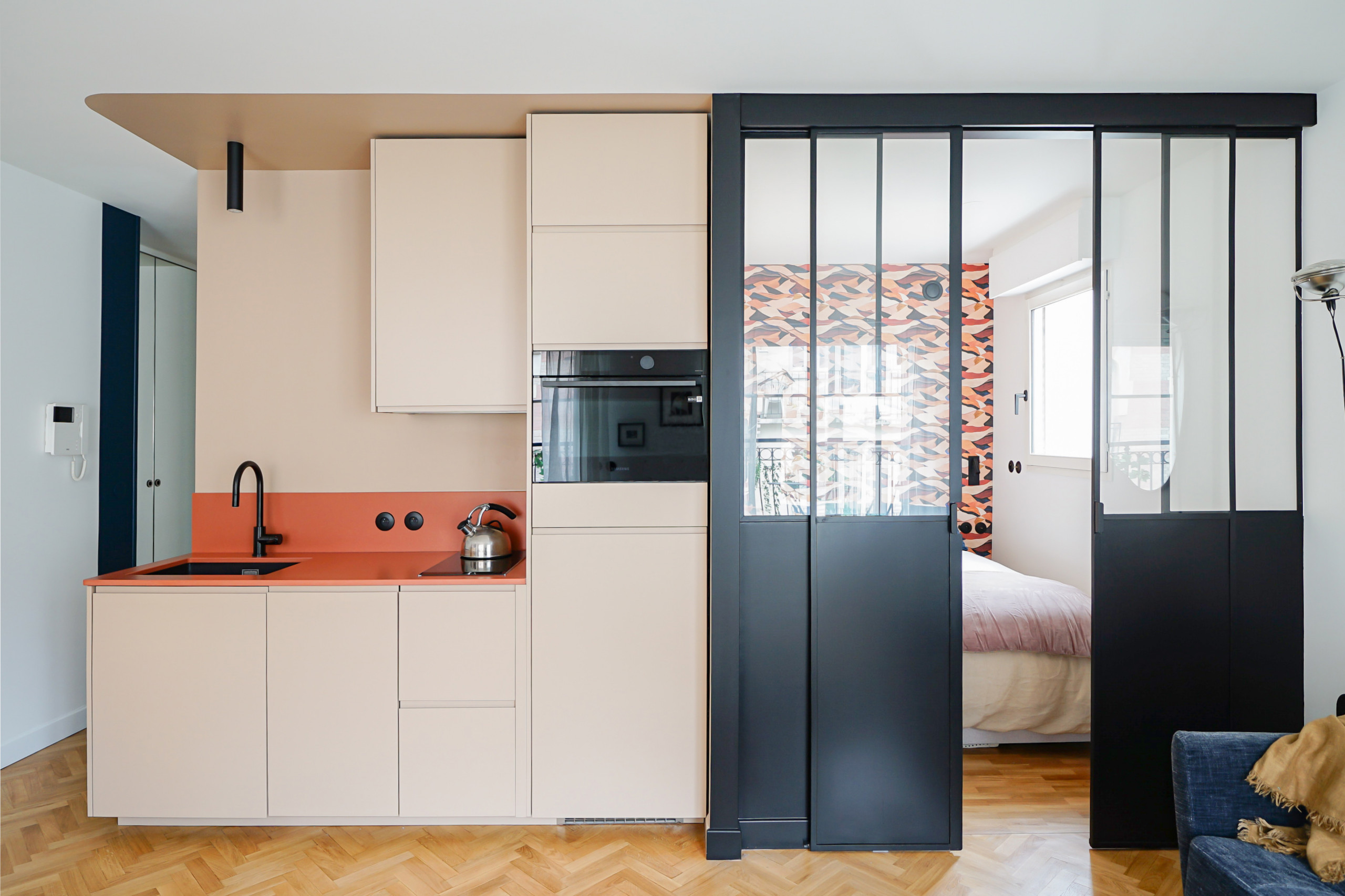 Après. À la place de l’ancienne cuisine se profile désormais le nouveau coin nuit. Bien que minimaliste (192,5×258 centimètres), cet espace permet d’accueillir un lit double (140×190 centimètres) et offre la possibilité de s’isoler sans étouffer, grâce à sa fenêtre existante. « Mes clients ont des enfants et ils envisageaient de pouvoir passer le week-end ensemble. Dans cette optique, ils souhaitaient que le coin nuit puisse se fermer », explique Aurore.