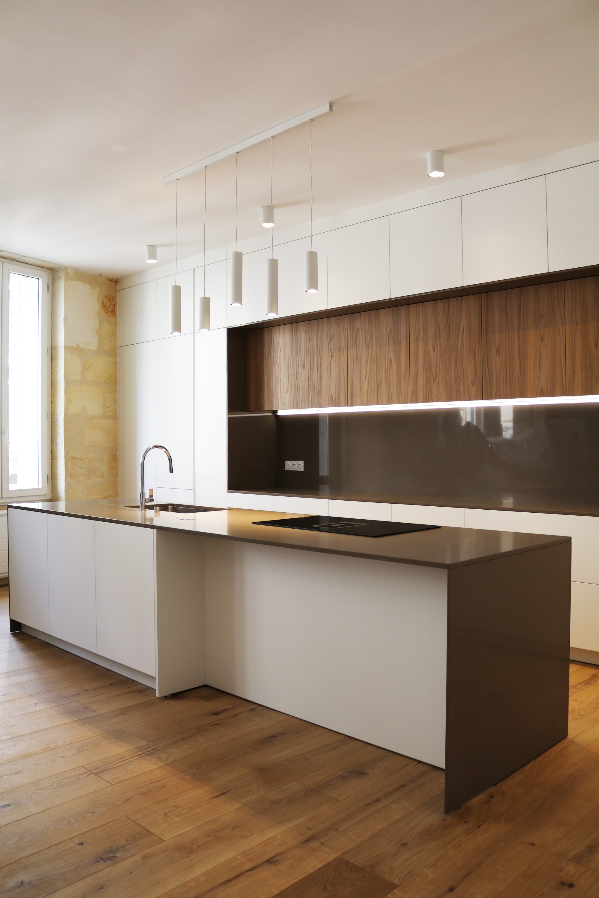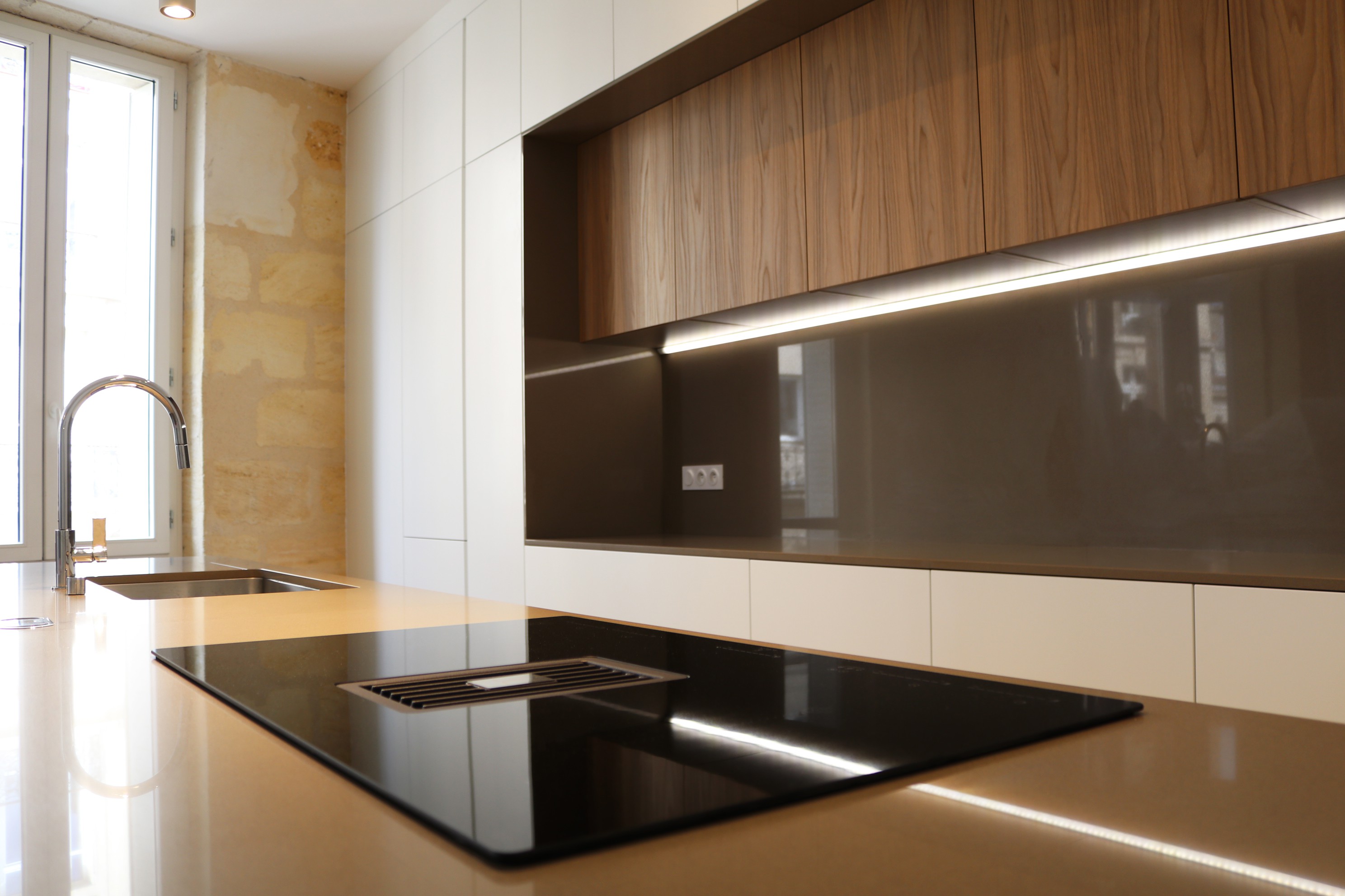 Dans cet immeuble ancien en pierre de Bordeaux, les propriétaires se sont orientés vers un mobilier classique et sobre, en laque blanche mate et noyer, rehaussée par des plans en quartz Silestone gris.