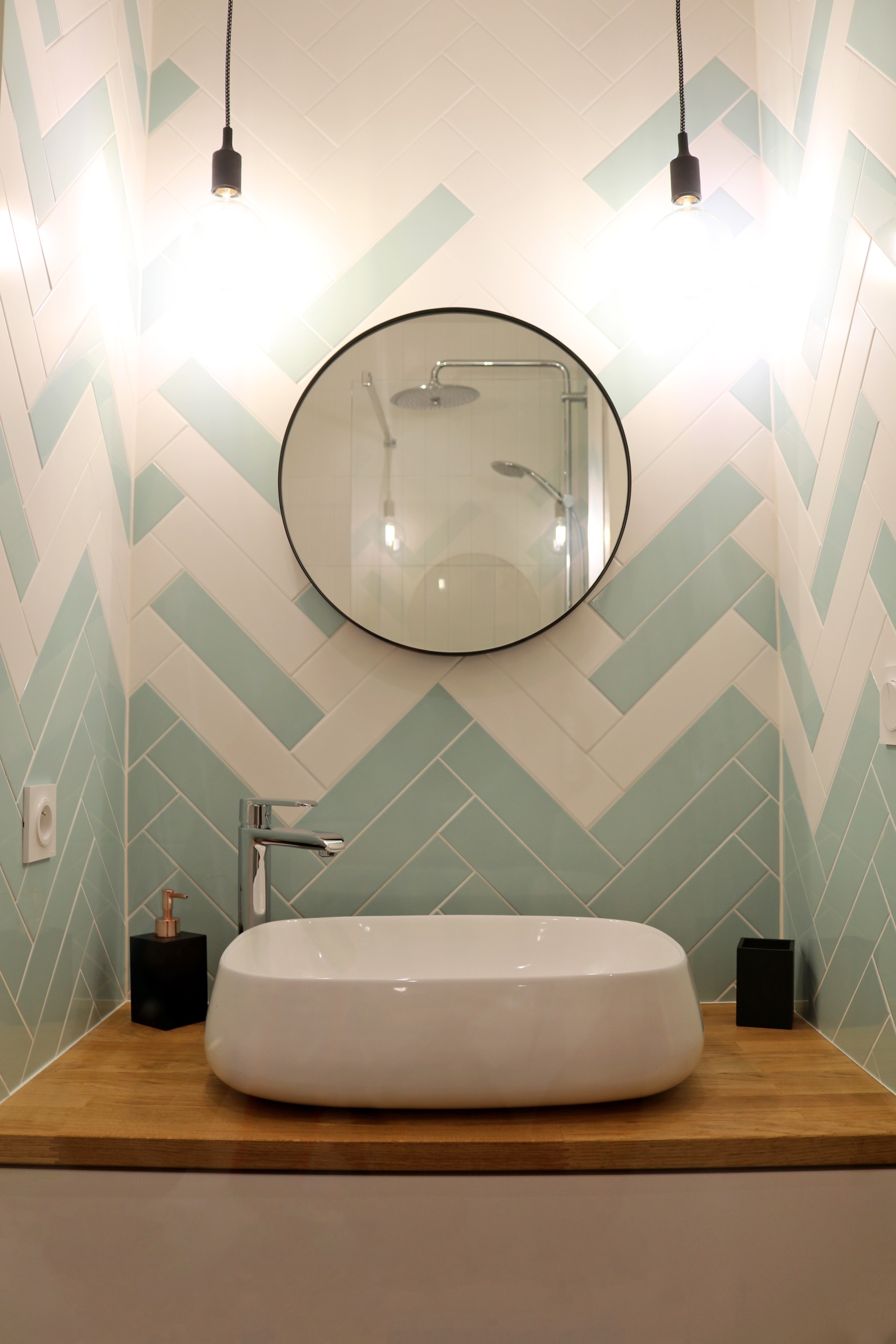 Après. Dans la plus petite, Laure a joué la carte de l’originalité et a proposé une pose de carrelage en chevrons avec un effet de dégradé : « Comme tout était très statique et qu’elle ne disposait pas de lumière naturelle, il fallait rapporter du mouvement autrement », justifie-t-elle.