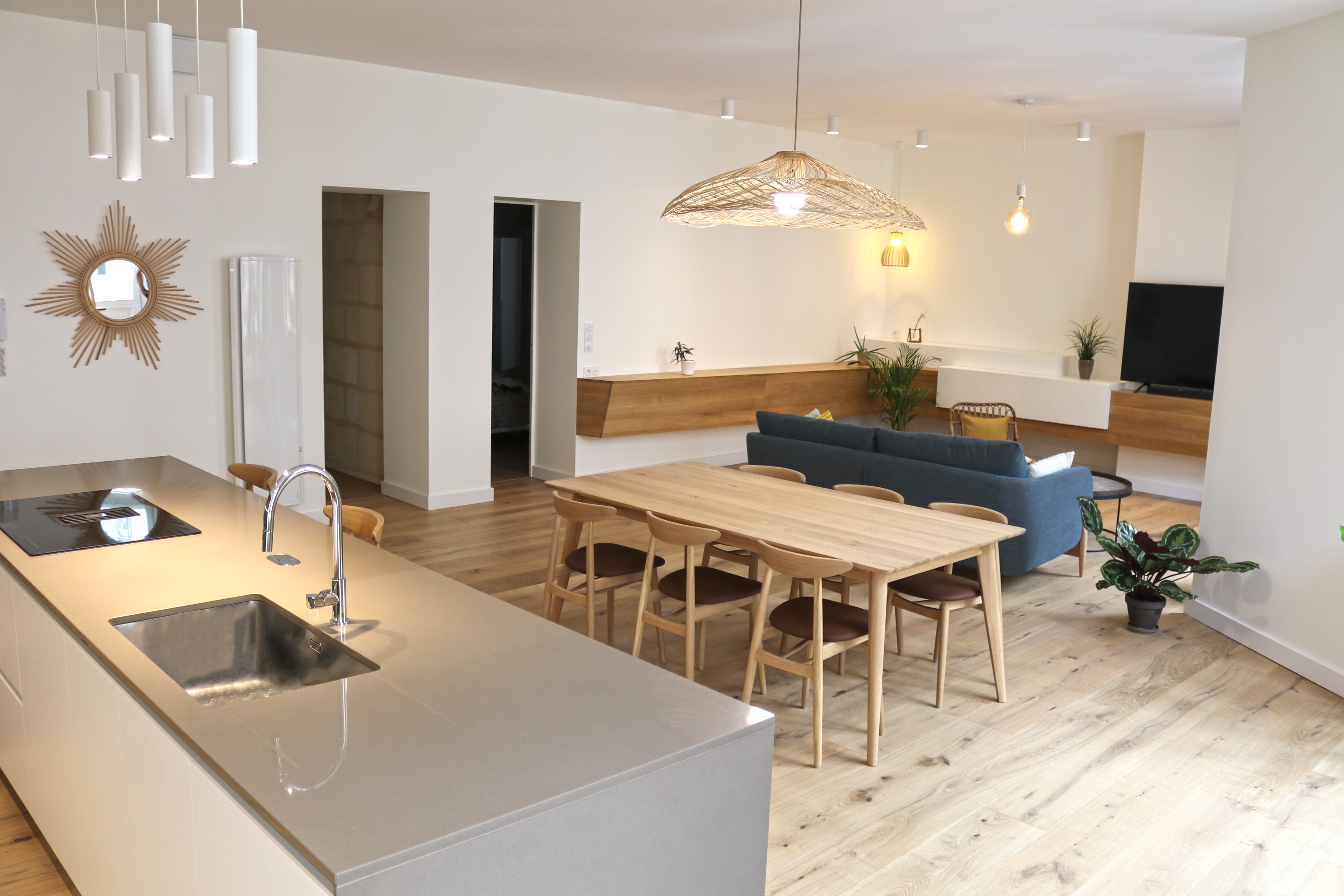 Après. La pièce de vie a été augmentée de la surface de la chambre d’amis. C’est dans cette partie que s’est niché le salon, délimité sur la droite par un rétrécissement créé par des conduits de cheminée et, sur la gauche, par un meuble sur mesure en bois massif venu s’enrouler sur deux de ses murs.