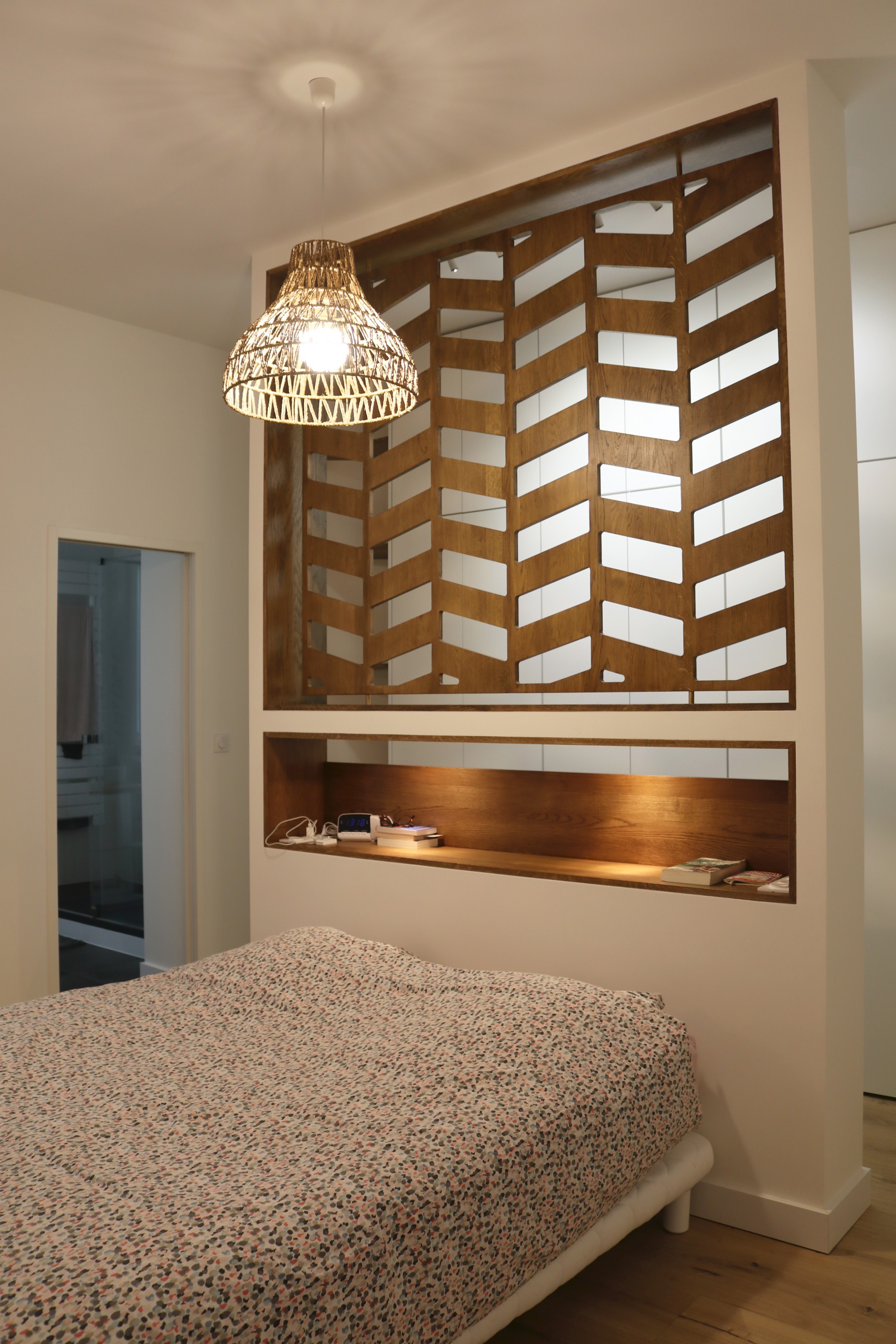 Après. Les propriétaires ont retenu l’idée du lit posé en îlot au centre de la pièce, contre une tête de lit ajourée. Celle-ci laisse une circulation à l’arrière pour le dressing tandis que son motif chevrons ajoute une dimension artistique à la pièce : « Elle a été réalisée par un menuisier à partir de panneaux de chêne massif découpés au laser puis posés sur le cadre à l’aide de quatre éléments en laiton. Ils semblent ainsi en lévitation », nous fait remarquer Laure.