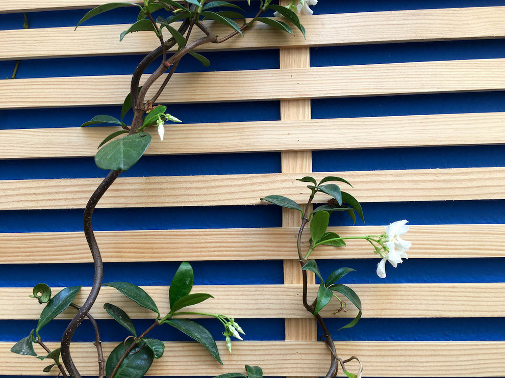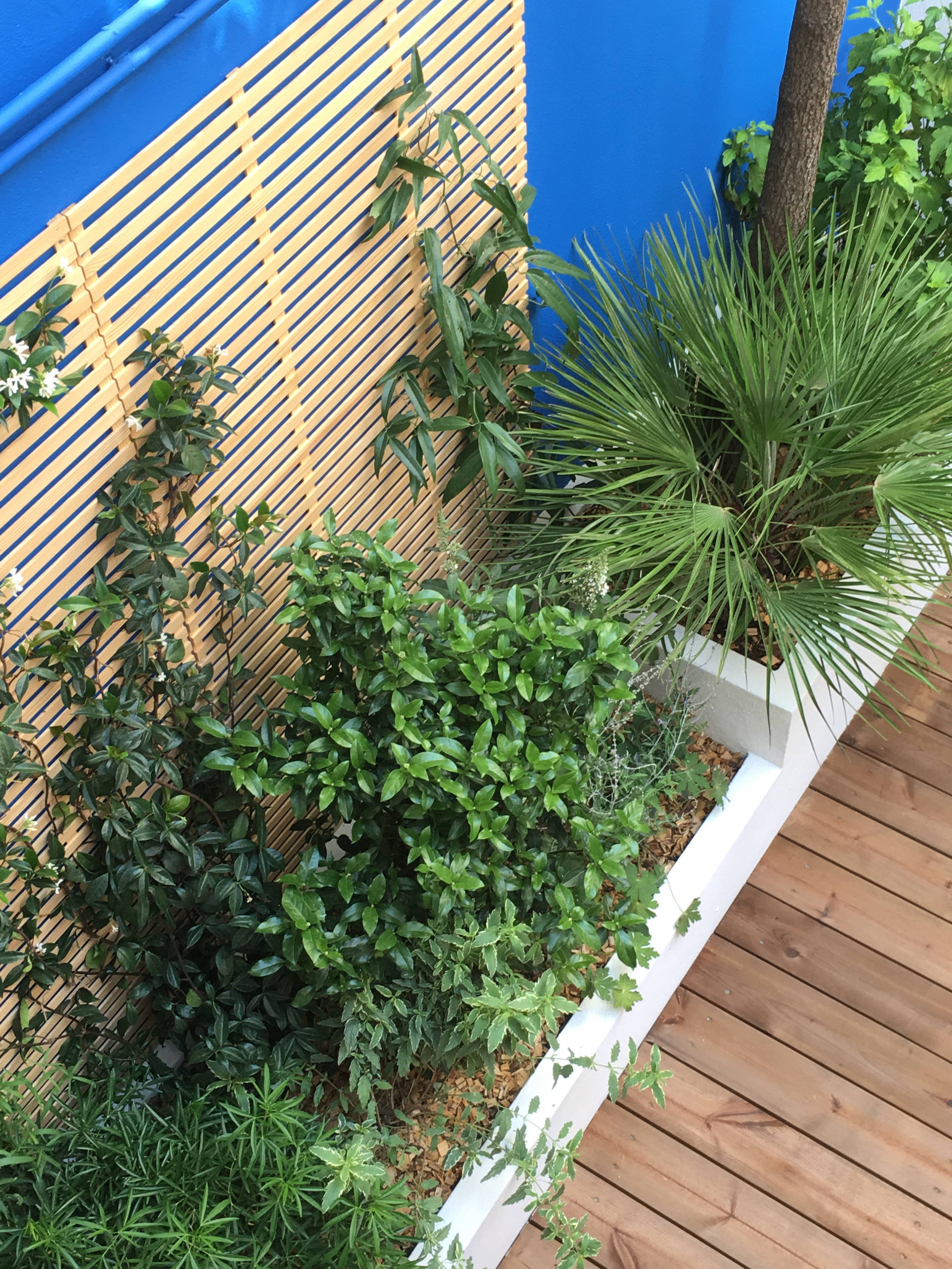 En partie haute, on a redonné un coup de jeune au bac béton avec de la peinture blanche et un treillage en pin à fines lattes horizontales. Ce dernier est à la fois graphique et utile puis qu’il permet de palisser des plantes grimpantes et odorantes : le jasmin étoilé et la clématite armandii à la belle floraison blanche, précoce en saison.