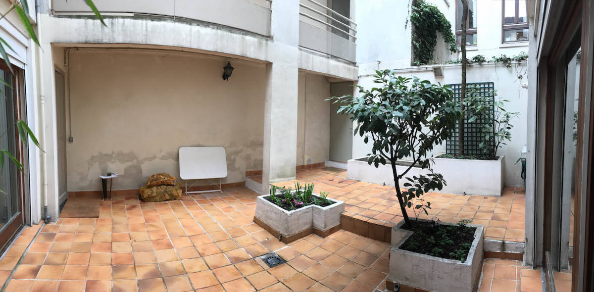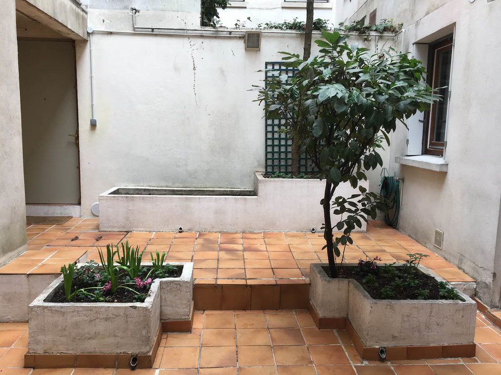 Comme bien des courettes d’immeubles parisiens, celle d’Antoine et d’Émilie est encaissée entre quatre murs, mais sa superficie de 30 m² lui permettait de prétendre à un aménagement car elle récupère en partie les rayons du soleil dans l’après-midi. Elle avait d’ailleurs déjà été aménagée dans les années 80, comme en témoigne le carrelage flammé sur ce cliché, qui date d’avant l’intervention d’un paysagiste.