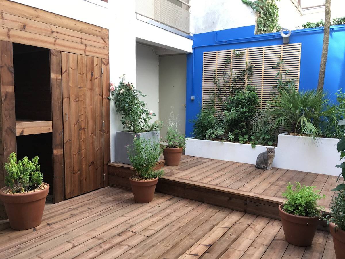 La courette un peu triste d'Émilie et Antoine a été transformée en un patio contemporain dans le style de leur duplex