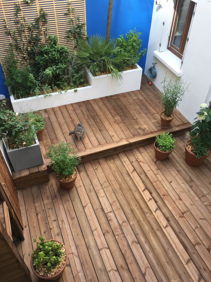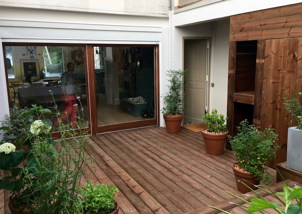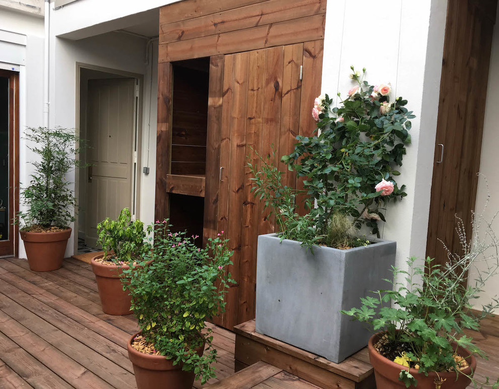 Le jeune couple avait un petit budget de 10 000 euros pour privatiser réellement cette courette et en faire le prolongement de son appartement, bref la transformer en patio habitable. Ils avaient envie de verdure, d’un endroit chaleureux et épuré et avaient besoin de rangement. En effet, la partie surélevée de la terrasse dissimule leur cave, que l’on atteint par une trappe. Cette dernière, humide, abîmait leurs affaires (valises, bricolage, vélos…) et ils voulaient les déplacer.