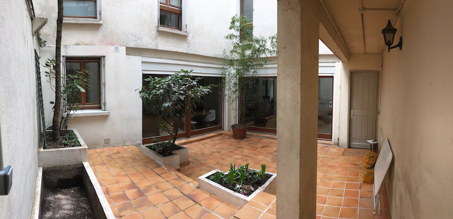 Cette photo est prise depuis l’entrée donnant dans la rue. On circulait tout droit sous la coursive afin de rejoindre la porte d’entrée de l’appartement. La baie vitrée de gauche est celle de la cuisine et celle du fond donne dans le salon des propriétaires.