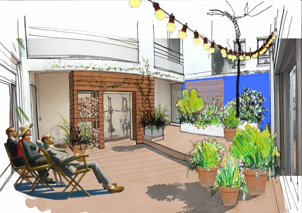 Comme à son habitude, le paysagiste Kevin Clare a commencé par griffonner et voici le premier dessin qui leur a livré. Comme il ne manque pas d’humour, il a collé les personnages de la peinture People in the Sun d’Edward Hopper dans sa mise en scène, pour mettre Émilie et Antoine dans l’ambiance. Au programme, terrasse chaleureuse et épurée, verdure et couleur !