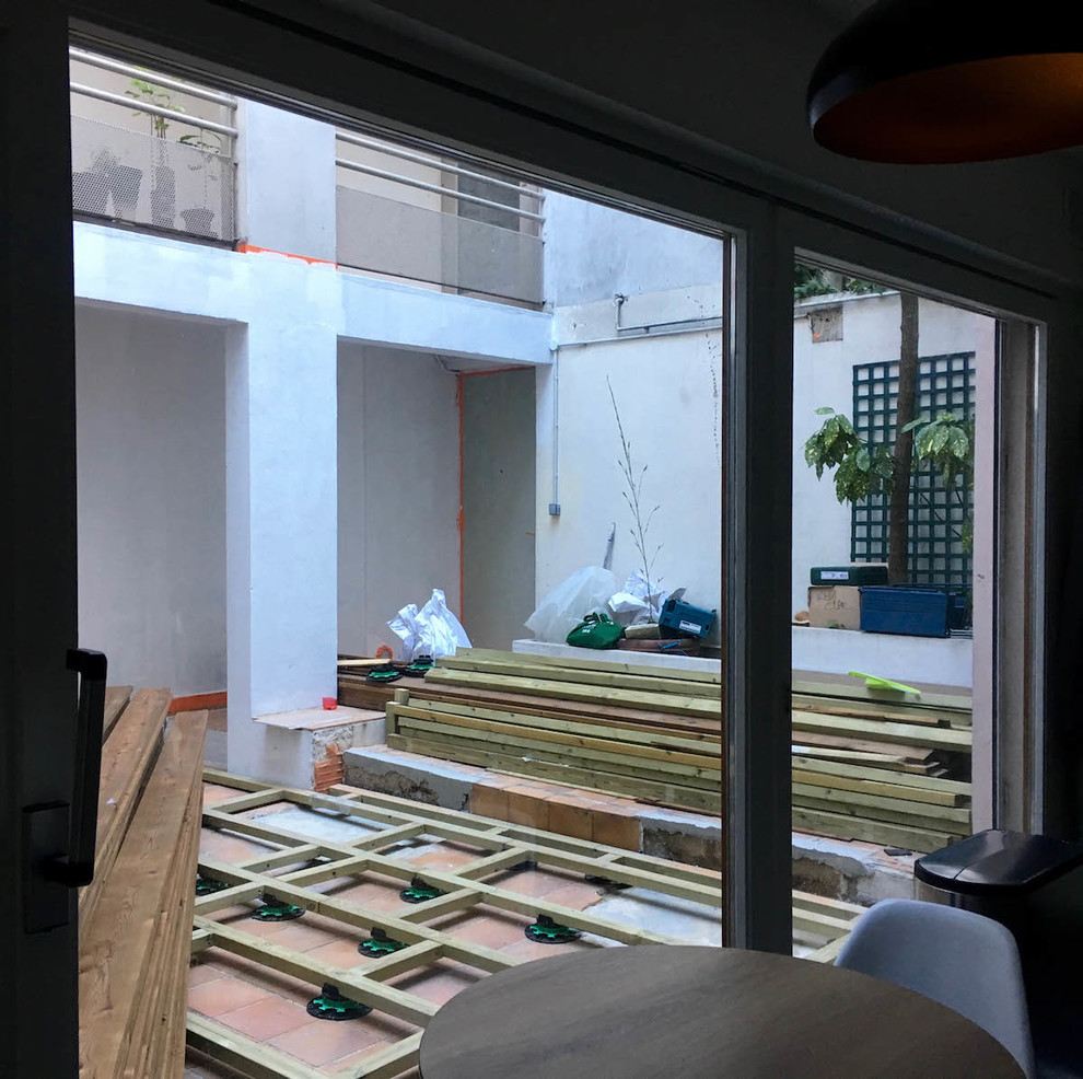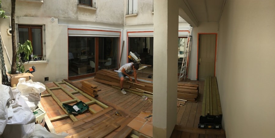 Voici la courette en cours de travaux. Les murs blancs ont été tous repeints, les volets roulants de l’appartement ont subi une toilette et de l’électricité a été posée pour intégrer un éclairage sur le mur du fond et dans le meuble de rangement. En ce qui concerne ce dernier, son emplacement a été prévu sous la coursive.