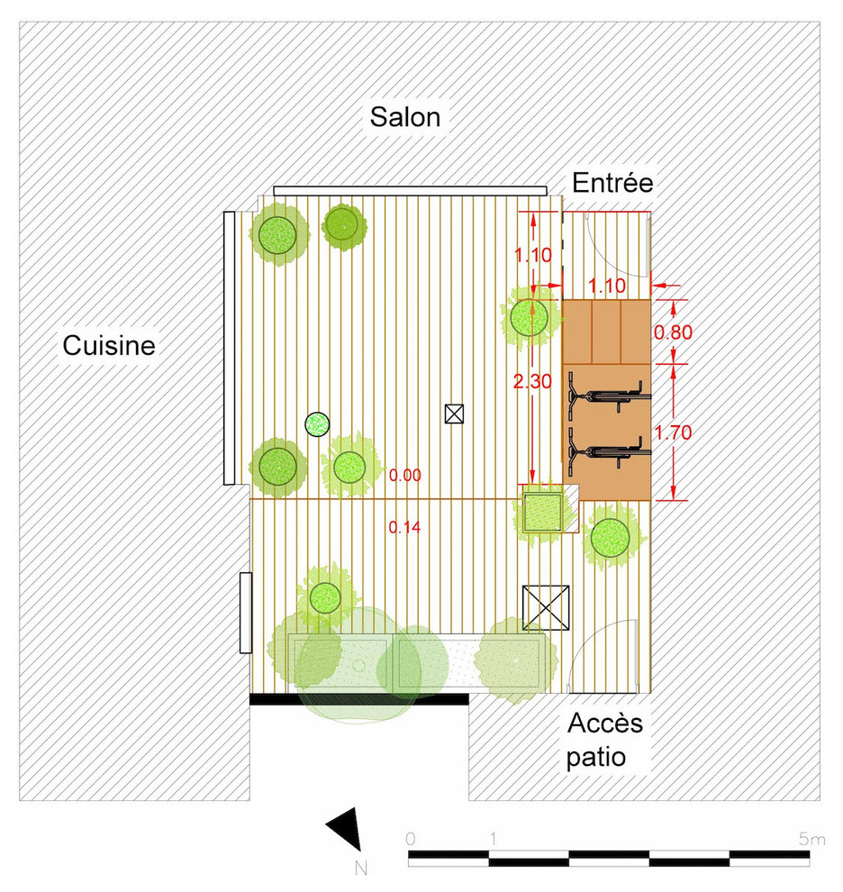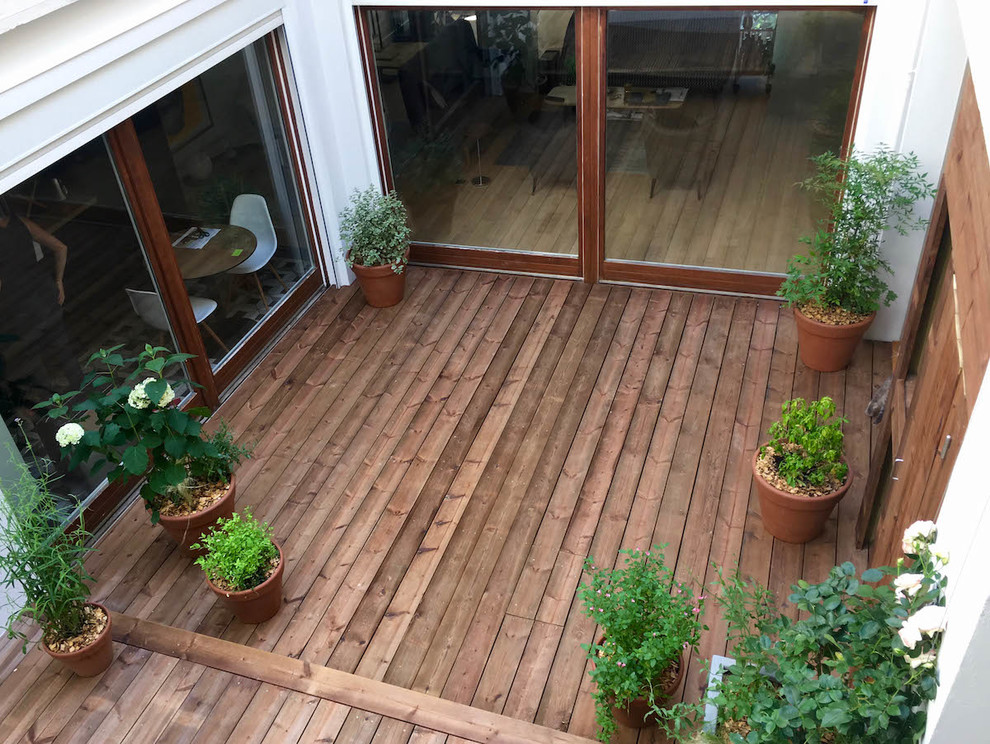 Pour rendre attrayant cet espace qu’allaient traverser quotidiennement Émilie et Antoine et visible depuis leur appartement, le patio a été traité comme un plancher extérieur en prolongement de celui de la pièce de vie. Le bois s’est imposé pour son côté chaleureux et pour sa facilité à être travaillé, qui permettait de traiter le meuble de rangement dans la même essence. « Nous avons opté pour du pin thermochauffé, qui se distingue du pin autoclave par sa couleur brune et non verdâtre. C’est un traitement plus durable et plus naturel. Nous ne sommes pas partis sur du bois exotique, pour une question de budget et également dans l’idée de ne pas déforester toujours plus la planète. Le pin est une essence locale, replantée et gérée durablement », justifie Kevin Clare. Pour accueillir des lames de pin brun, un solivage en pin a été constitué sur la terrasse existante, posé sur des plots plastiques réglables.