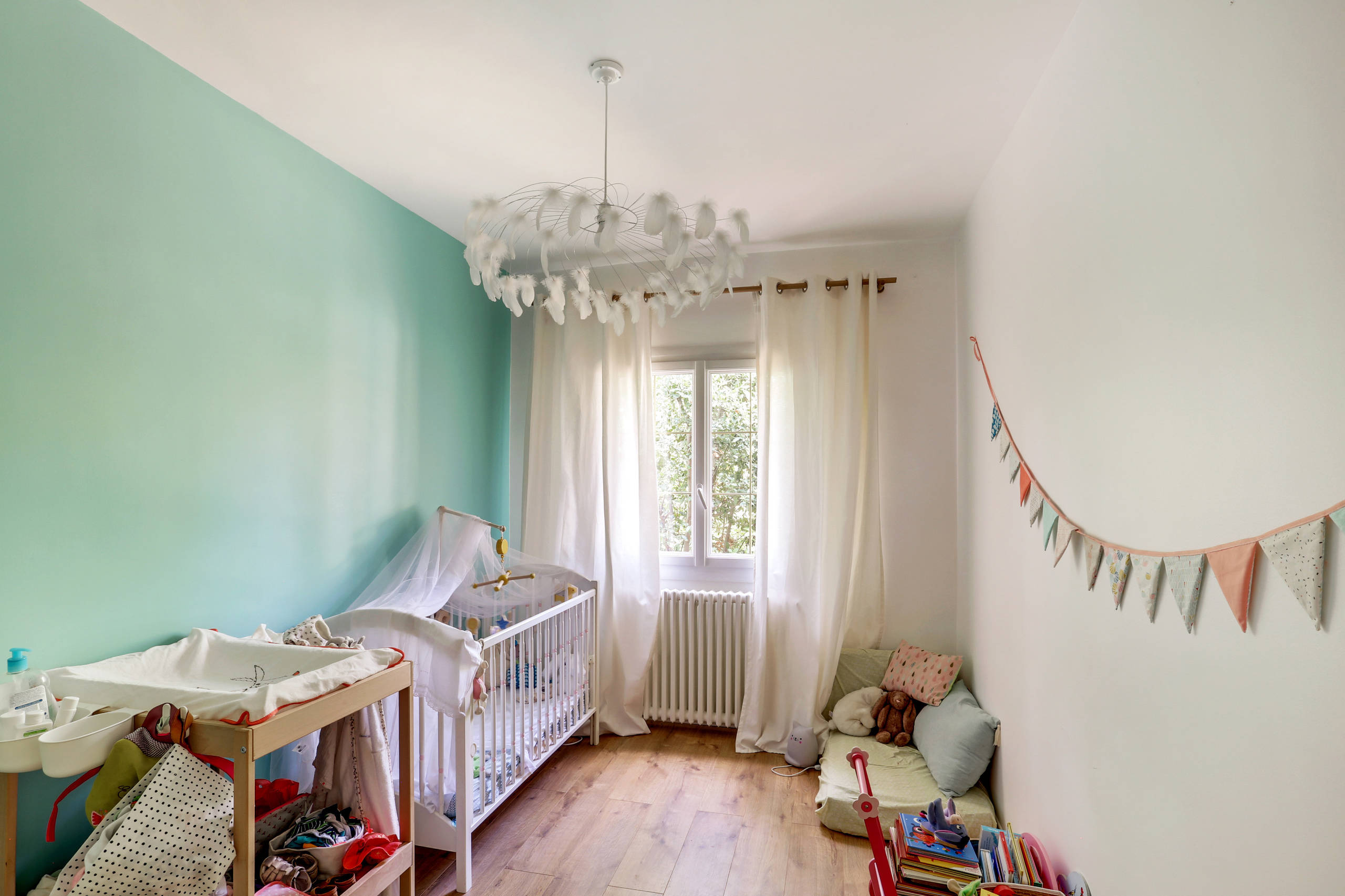 Dans la chambre du bébé, une vieille moquette assombrissait considérablement l’espace. Pour apporter un maximum de lumière et une touche de fraîcheur, le couple a misé sur des murs blancs associés à une peinture vert d’eau. Une suspension en plumes blanches apporte une ambiance douce et poétique à cet espace nuit.