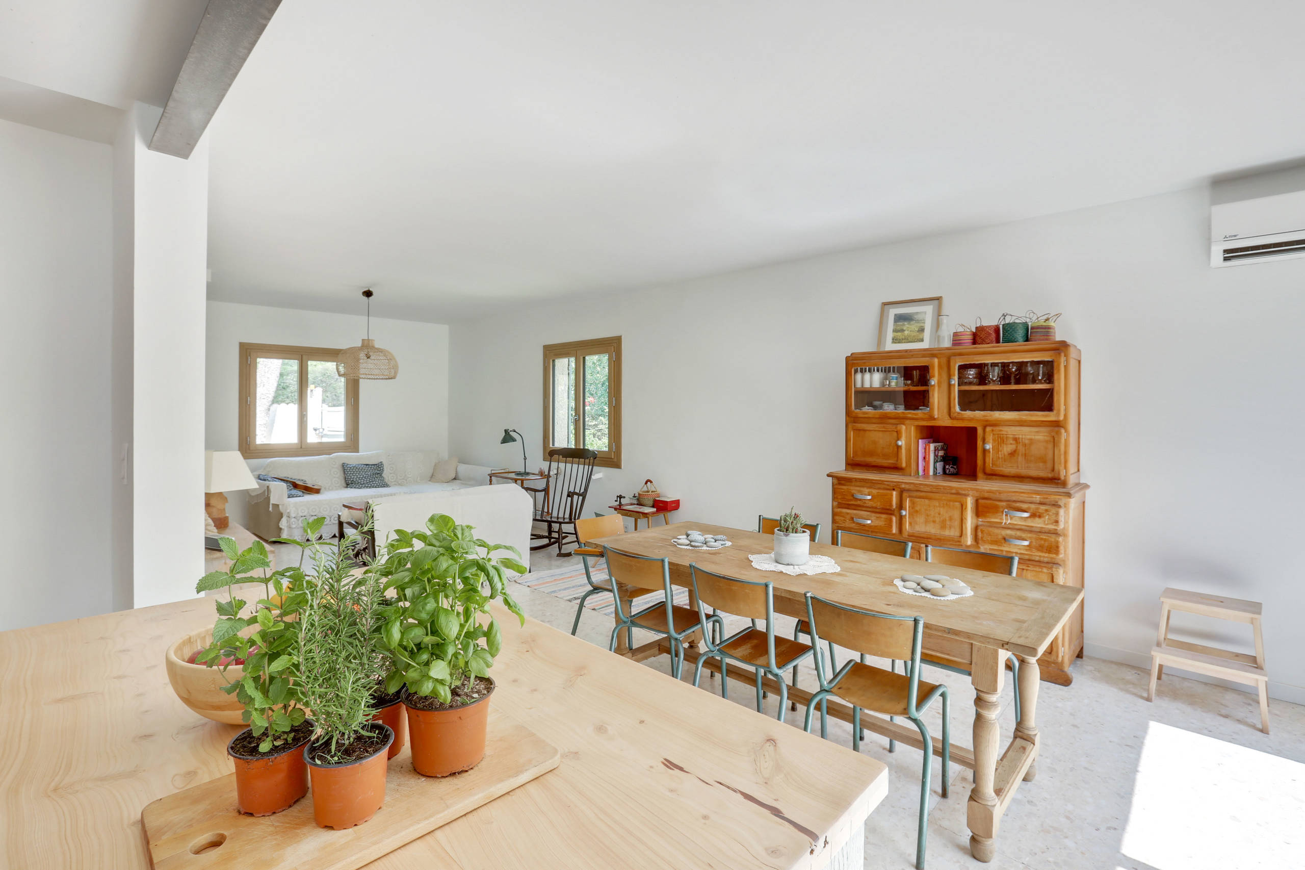 Le mobilier est un mix entre vintage et récup’. Le meuble buffet et la table ont été chinés chez Emmaüs et retapés par les propriétaires des lieux. La table ancienne en chêne massif a été poncée et vernie par les propriétaires des lieux.