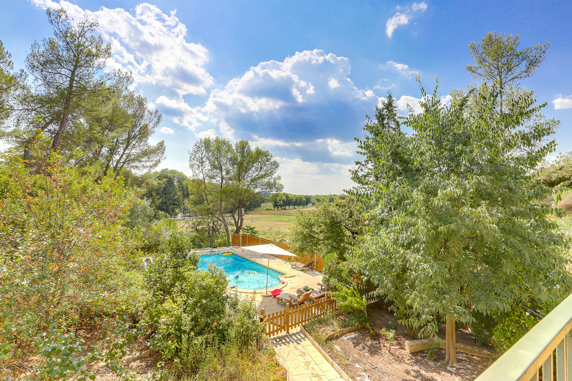 Entouré de verdure à perte de vue, le vaste terrain d’une superficie de 1500 m² accueille une série de pins majestueux et une grande piscine en contrebas. Celle-ci a été entièrement restaurée afin de lui offrir une seconde jeunesse pour le plus grand bonheur de ses nouveaux occupants.