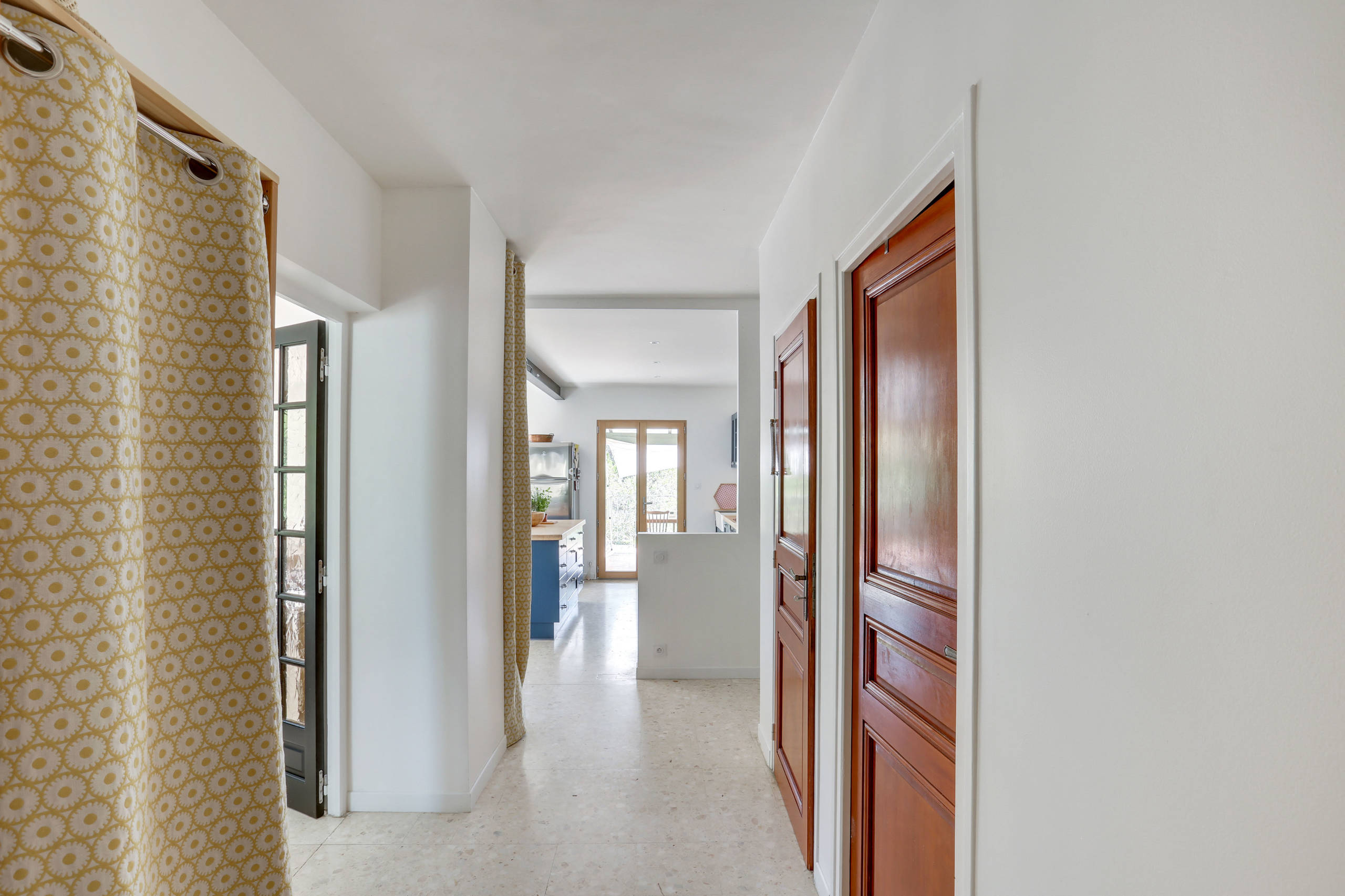 Après. « Pour minimiser le budget travaux, nous avons décidé de conserver le joli terrazzo d’origine. Ce matériau dans l’air du temps permet d’apporter de la fraîcheur durant les périodes de fortes chaleurs », affirme la professionnelle. À gauche, on aperçoit derrière le rideau, au premier plan, une penderie permettant de ranger les vestes et manteaux de toute la famille. Le dressing d’origine, qui se trouvait à l’emplacement de la salle de bains actuelle, a été récupéré et replacé ici pour optimiser cet espace de circulation.
