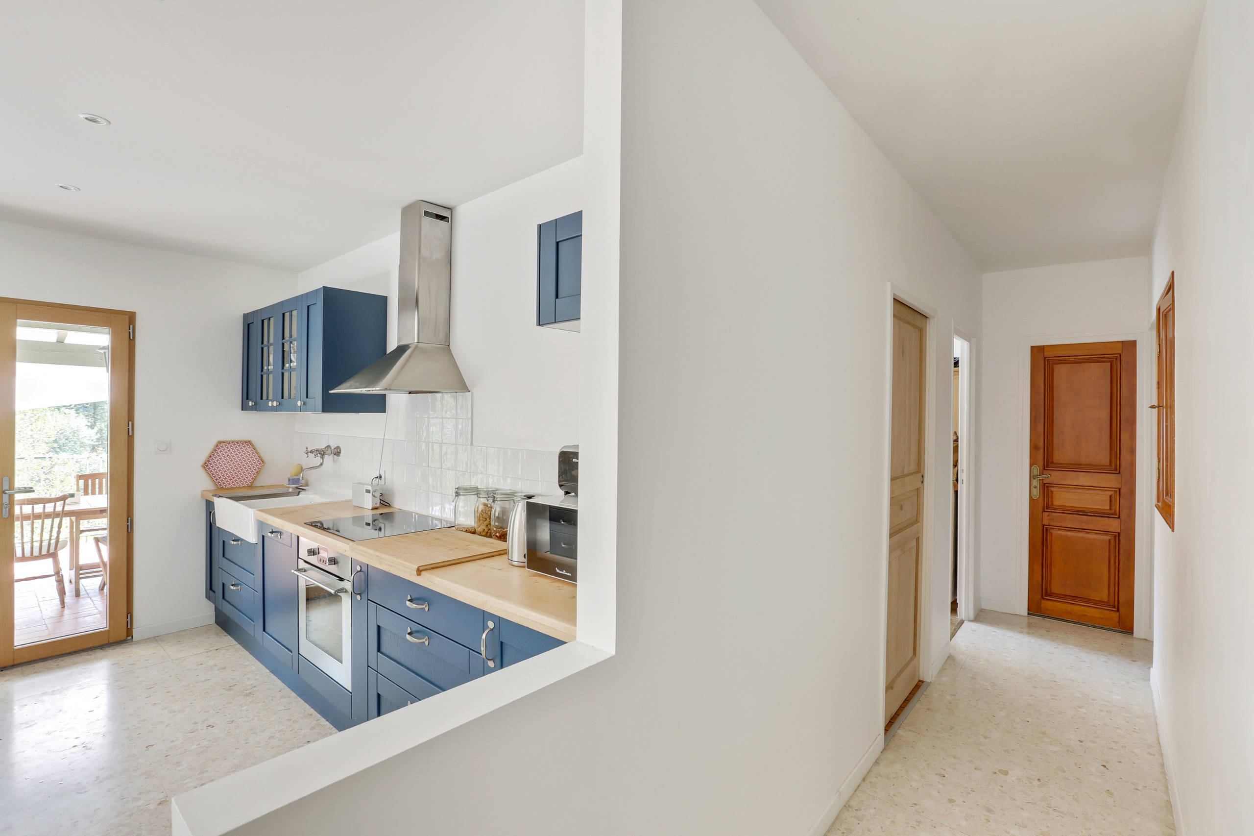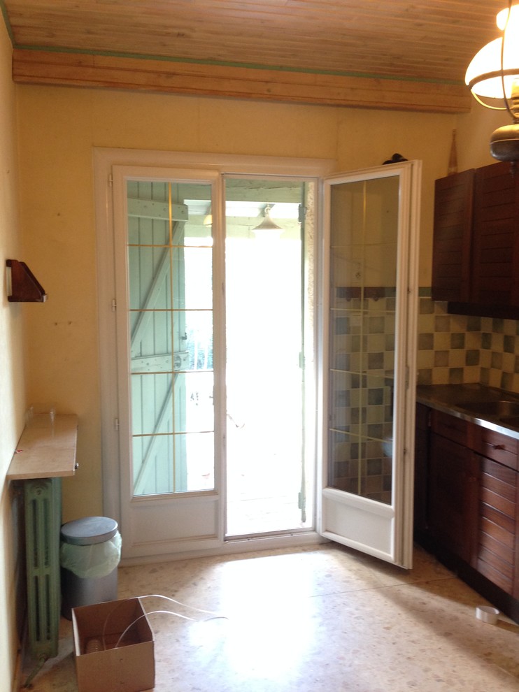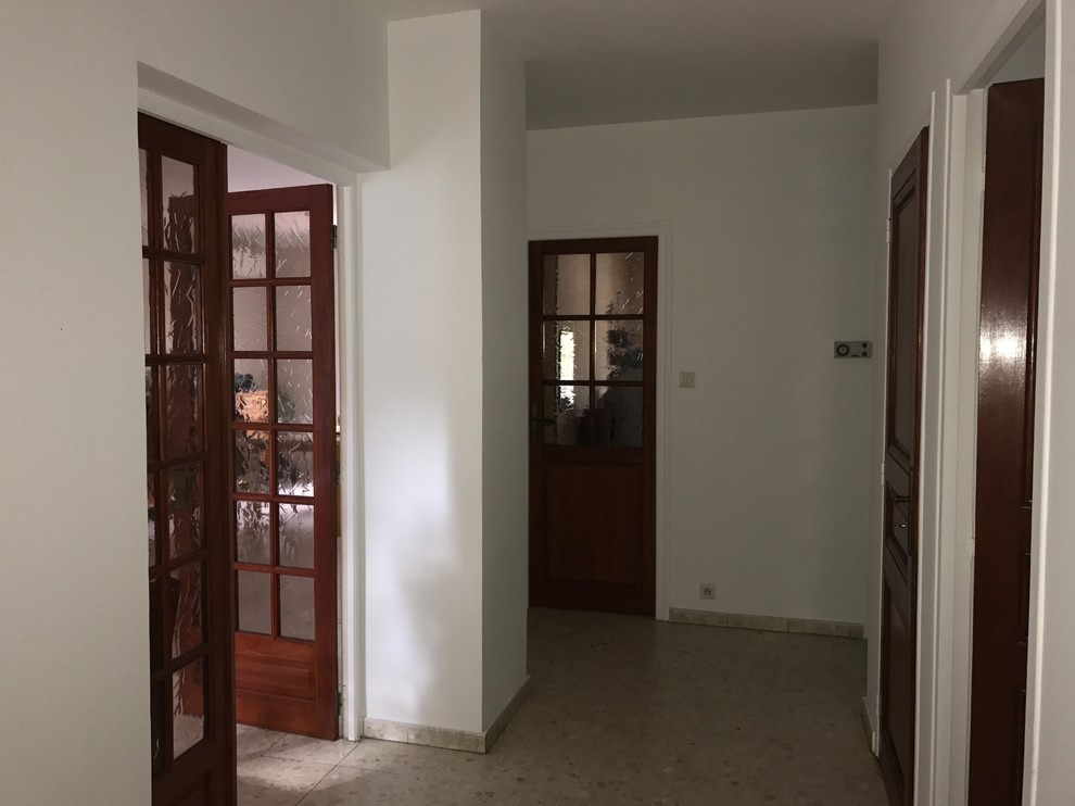 Avant. La cloison entre l’entrée et la cuisine a été abattue pour agrandir les volumes et apporter un maximum de luminosité. Cette entrée aujourd’hui méconnaissable bénéficie désormais d’une vue dégagée sur le jardin et la campagne environnante.