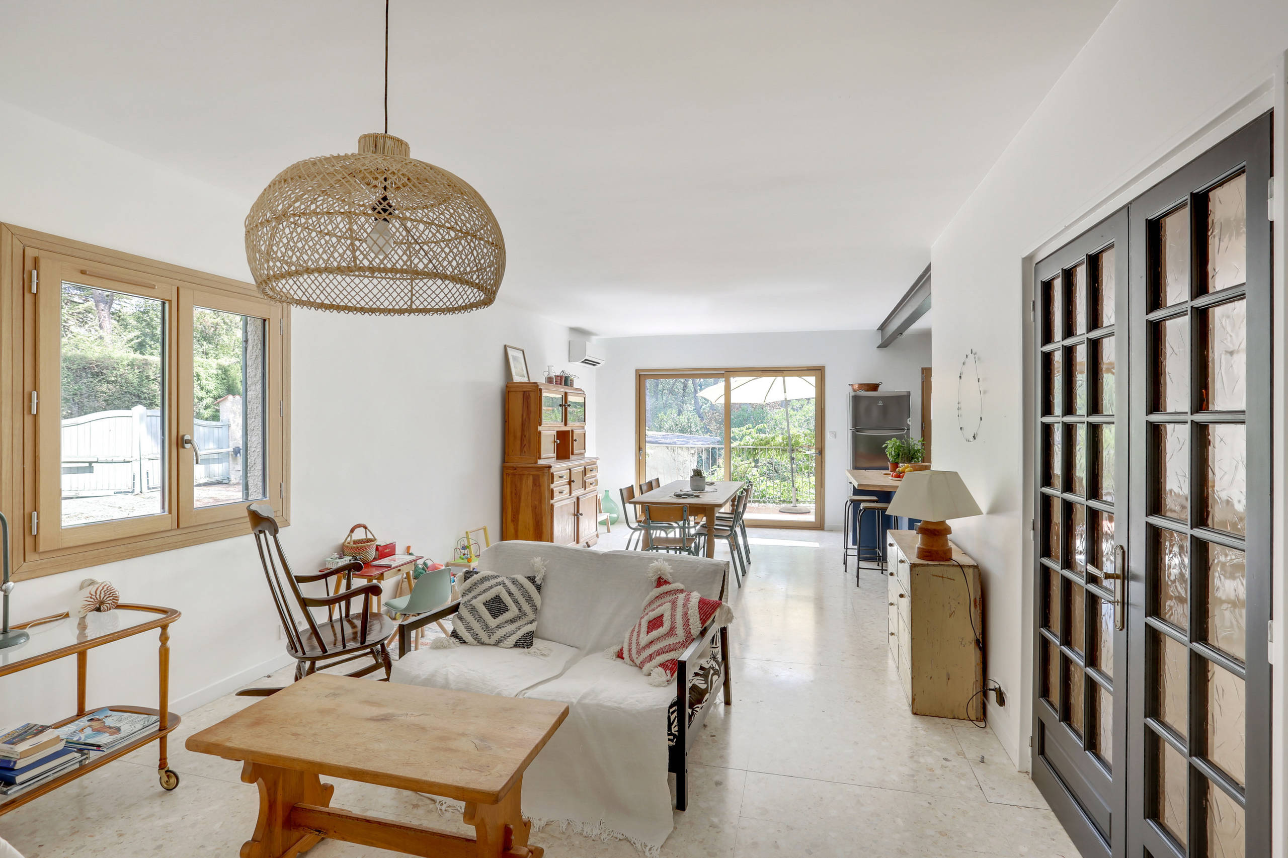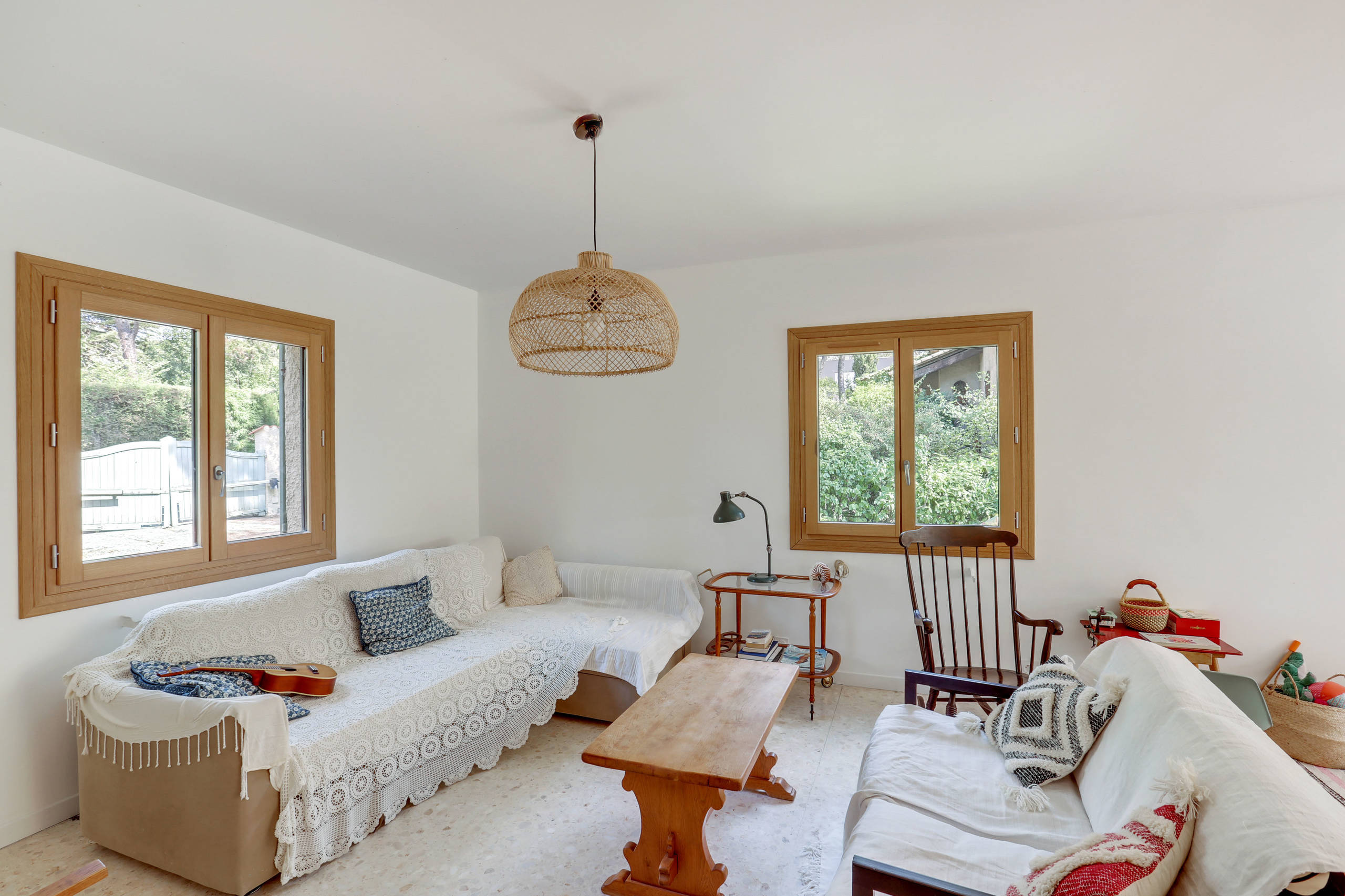 Après. Aujourd’hui, place au mélange des genres ! Les propriétaires des lieux ont opté pour une déco éclectique mêlant récup’, meubles vintage et contemporains. Une suspension en osier s’associe à une table basse en bois brut et à un fauteuil à bascule noir.