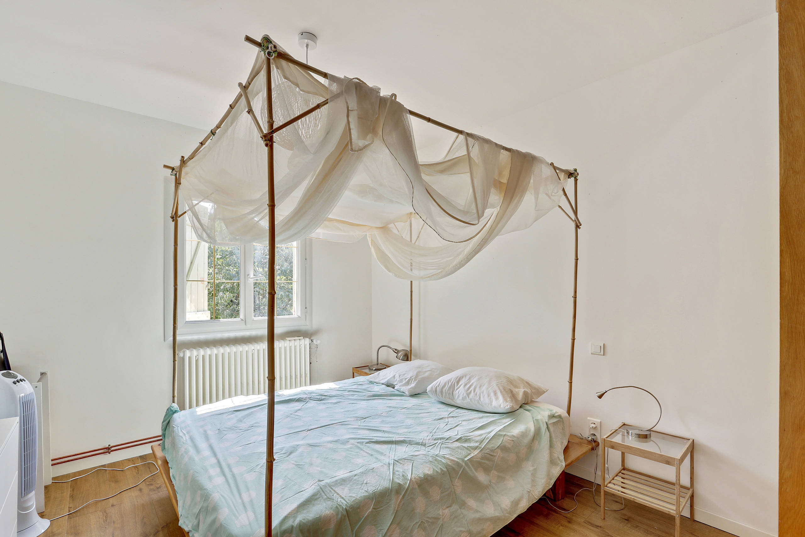 Les propriétaires des lieux ont installé un parquet en chêne massif dans les chambres. Ils ont construit eux-mêmes ce lit agrémenté d’une moustiquaire à l’aide de tiges de bambous. « Les propriétaires, véritables globe-trotters, se sont inspirés de leurs nombreux voyages pour construire ce lit à baldaquin qui offre une protection efficace contre les moustiques », explique Tina.
