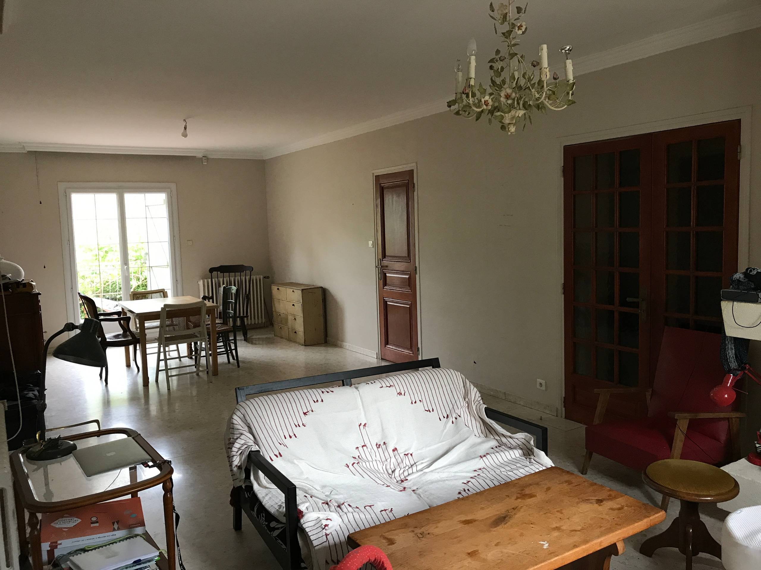 Avant. L’espace salon n’avait pas de style et le lustre lui donnait même un air vieillot.