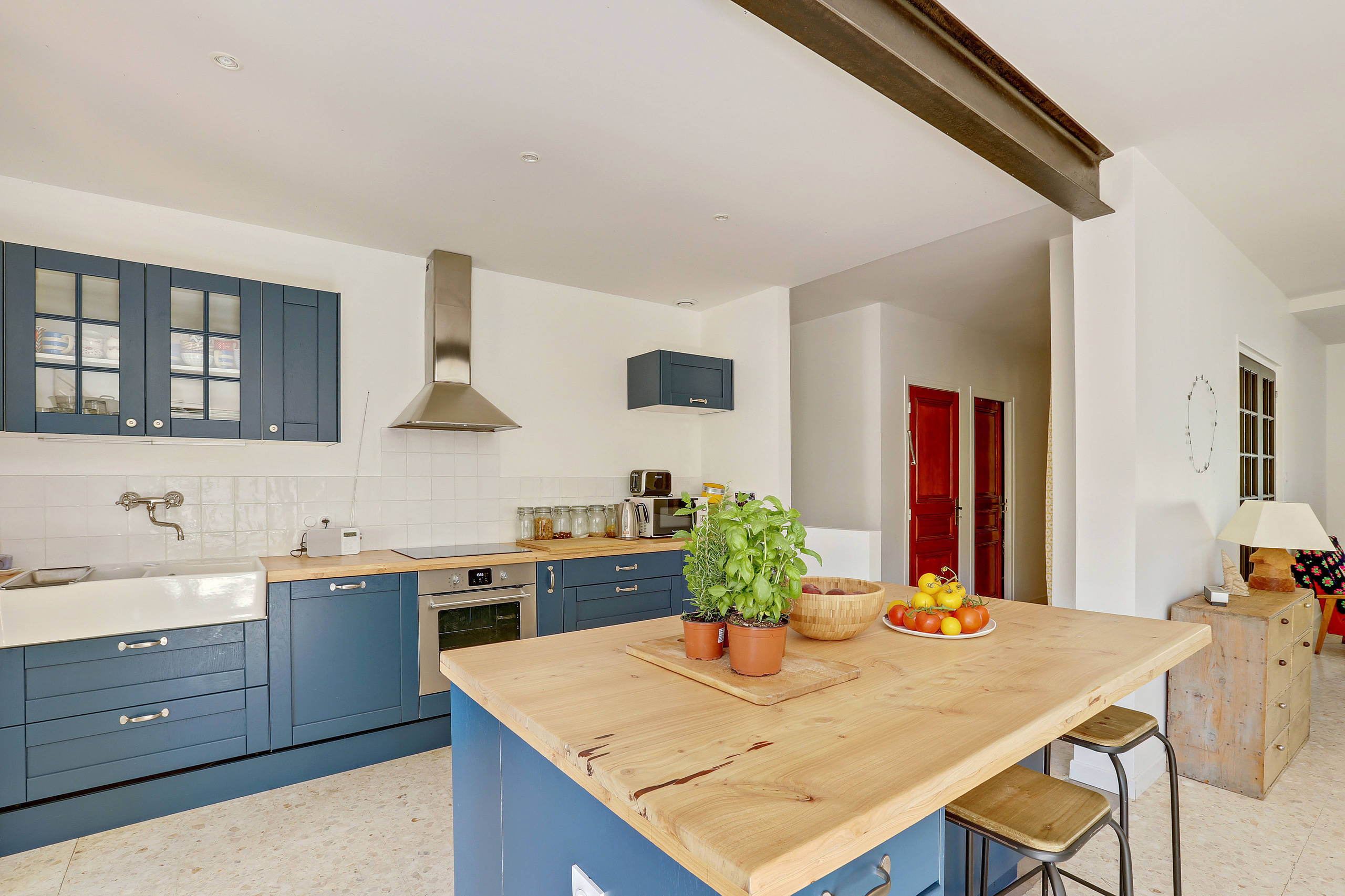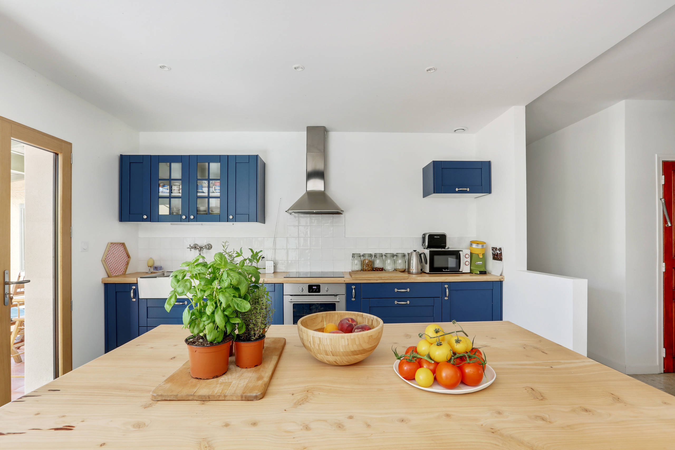 Le plan de travail de la cuisine a été réalisé à l’aide d’un plateau de cyprès que le couple a travaillé lui-même. L’aménagement mise sur la fonctionnalité avec un plateau en bois massif résistant et facile à entretenir, associé à une crédence en carrelage type zelliges.