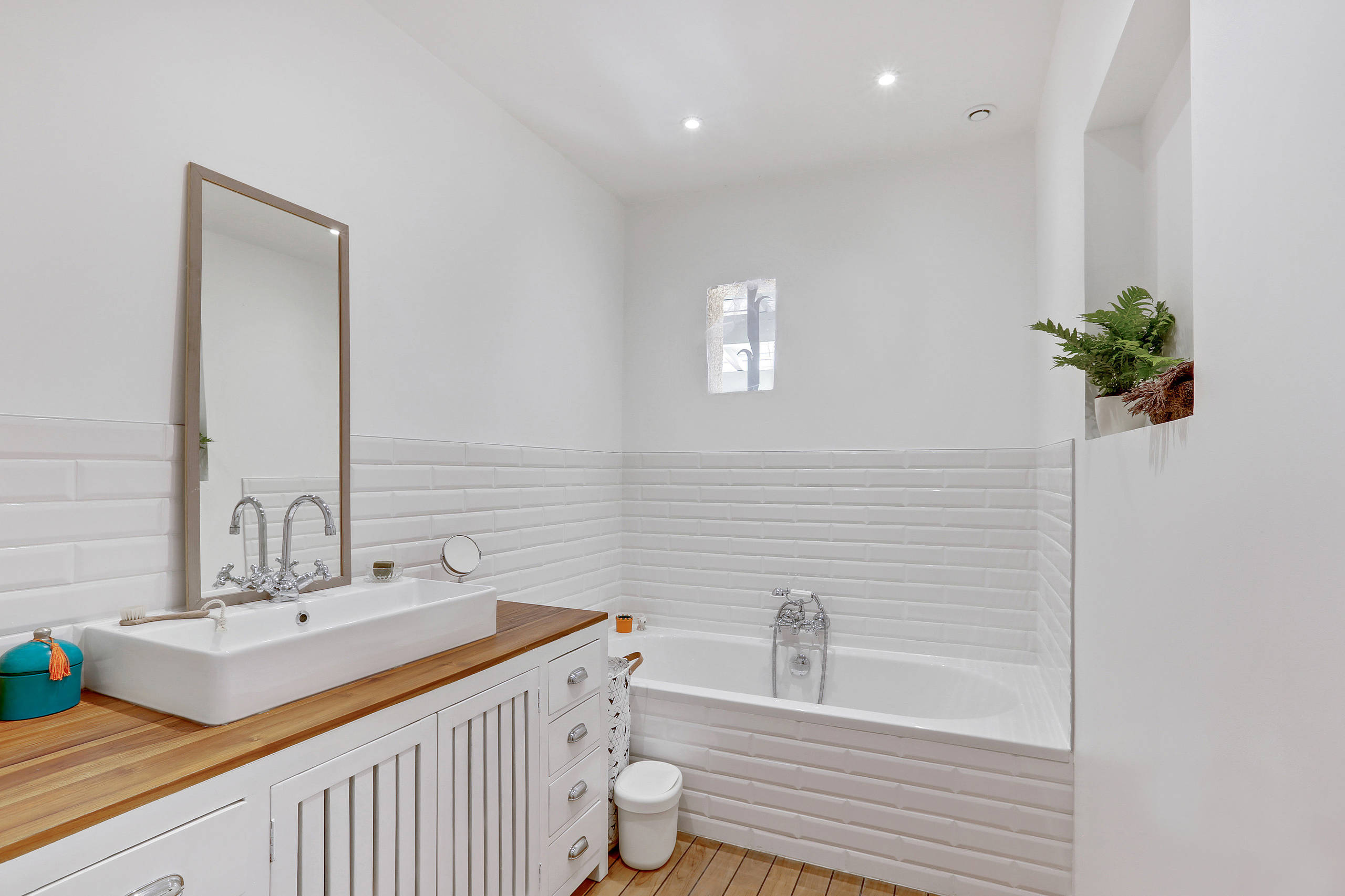 Dans cette salle de bains familiale, accueillant une douche et une baignoire, un parquet en teck avec des joints pont de bateau se marie à des carreaux métro. Le grand meuble en bois chiné par les propriétaires des lieux et son plan de travail en teck complètent ce décor épuré à la fois sobre et chaleureux.