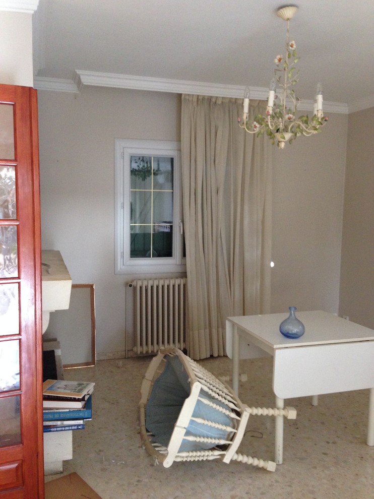Avant. Dans l’espace salon, l’imposante cheminée en pierre de style rustique a été déposée pour gagner de la place. « Les propriétaires des lieux prévoient d’installer un poêle à bois en fonte au centre de la pièce. Les travaux de rénovation se feront en plusieurs étapes », explique Tina.