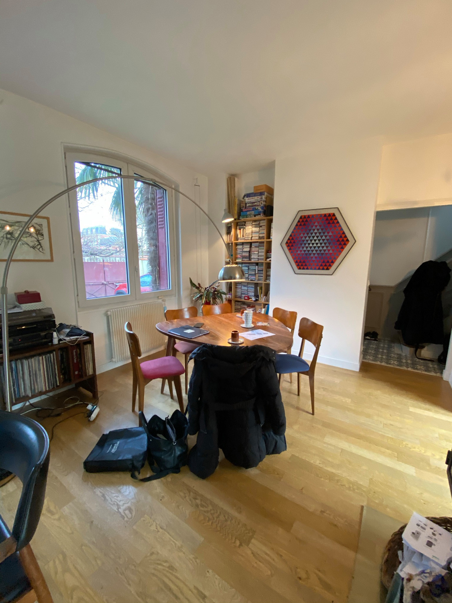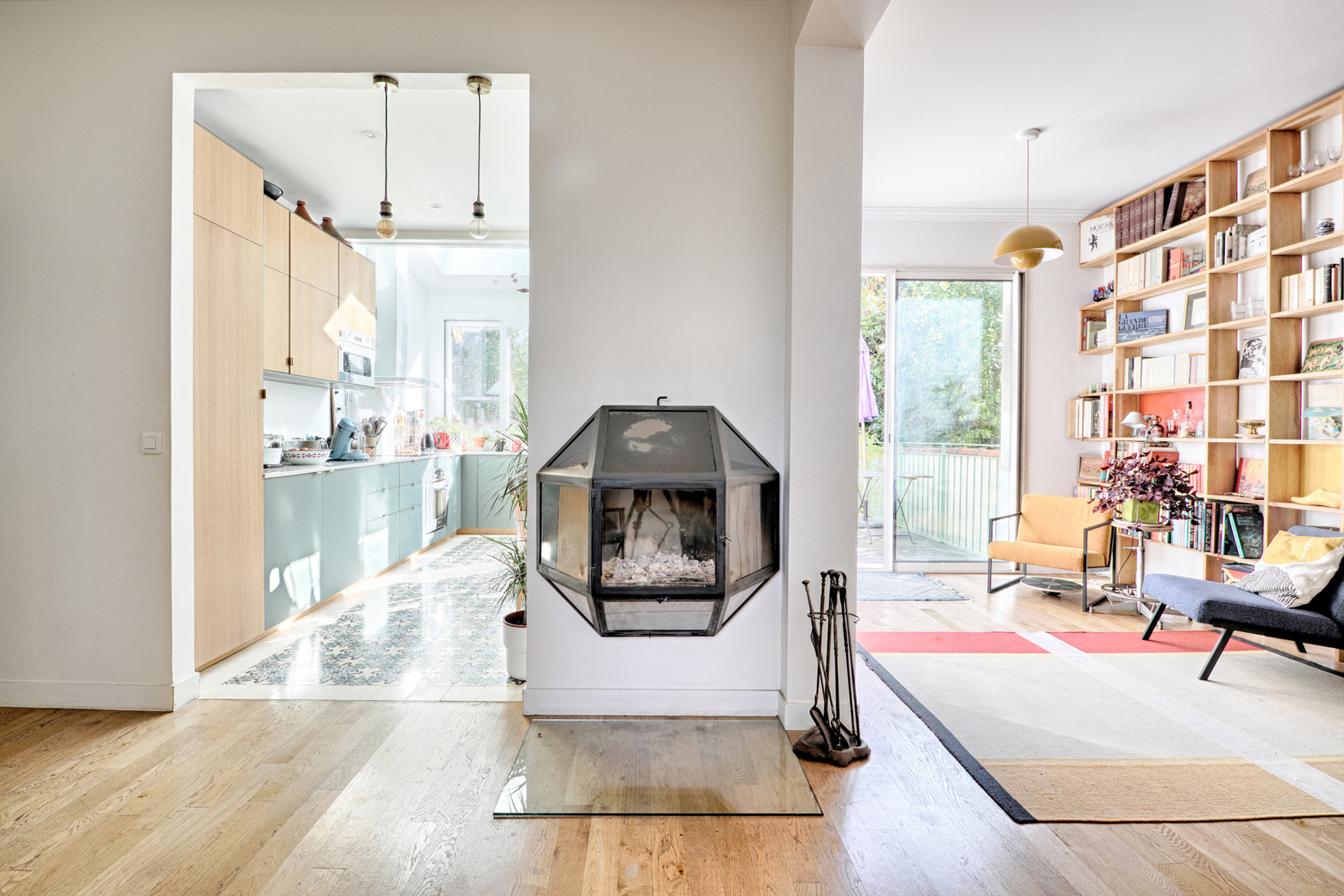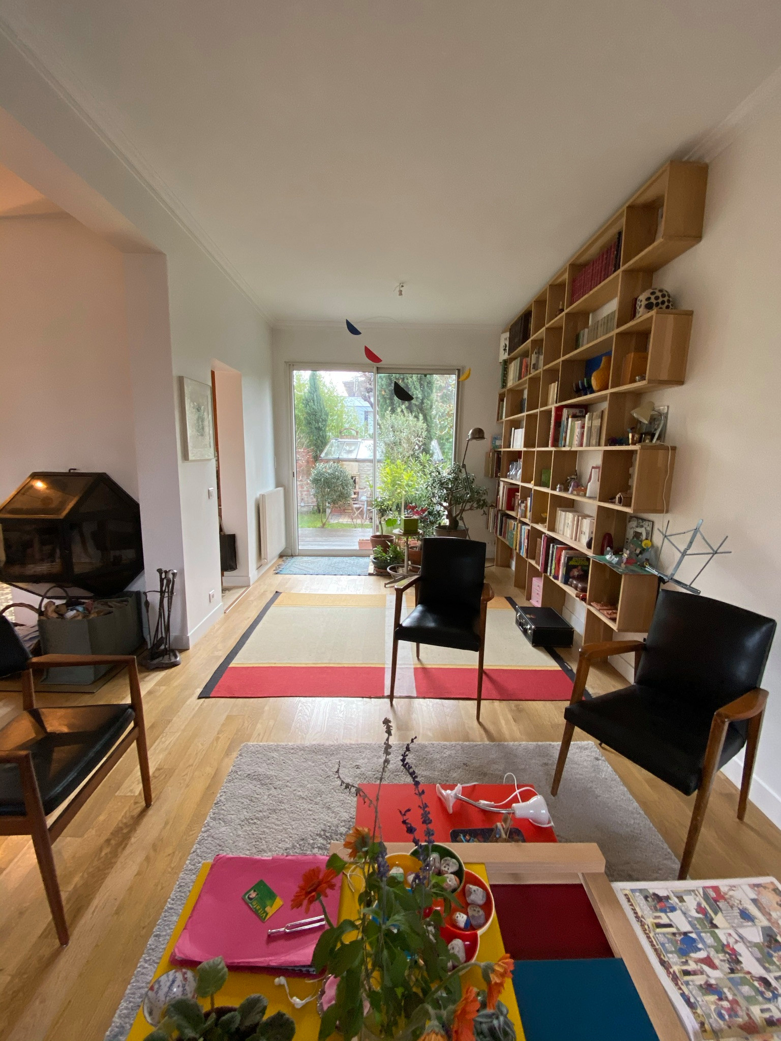 Après. Le séjour a été allégé de la table à manger après les travaux de l’extension de la cuisine. Il est désormais plus épuré. Sur la droite, le coin bibliothèque est resté à sa place.