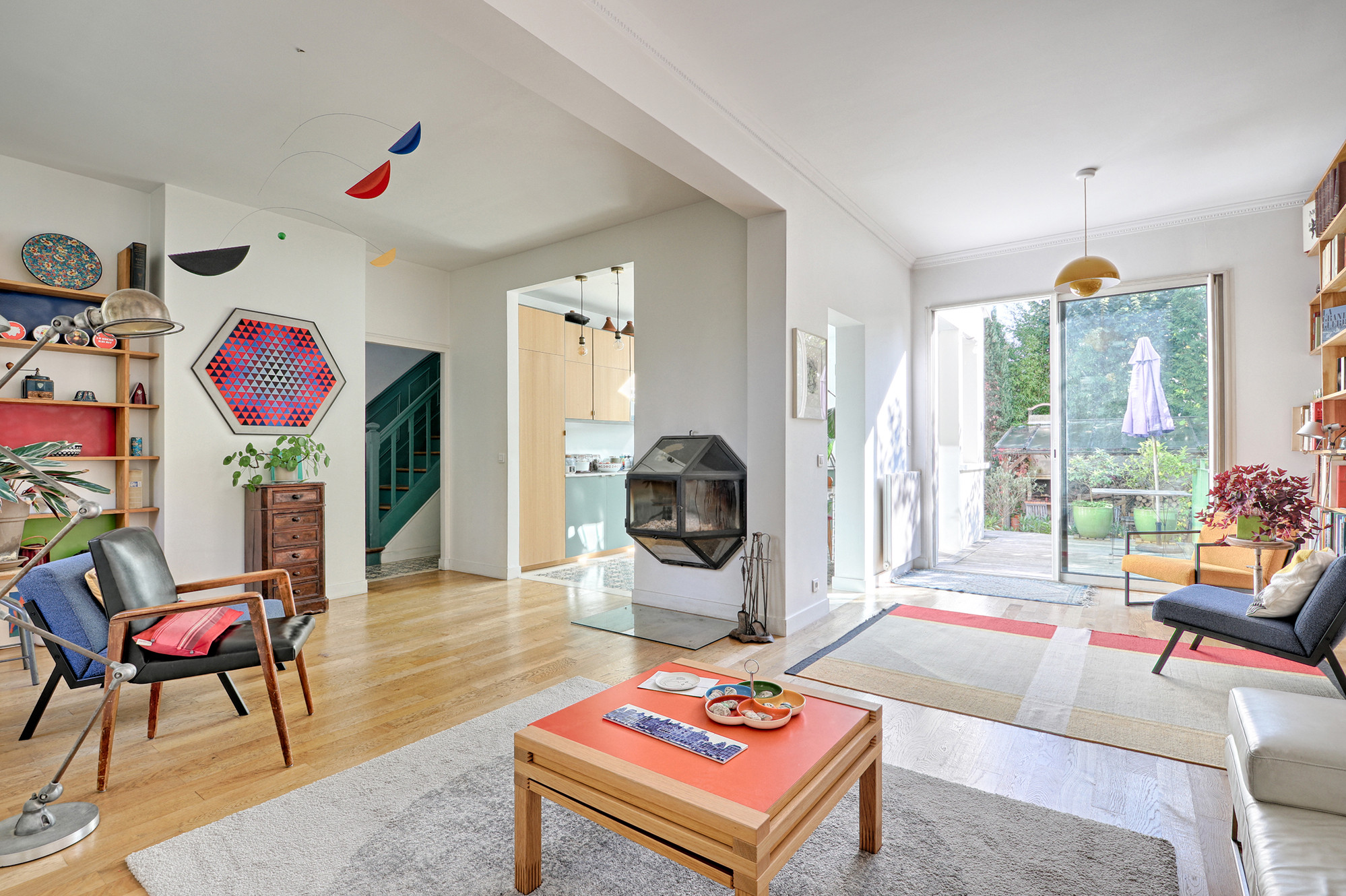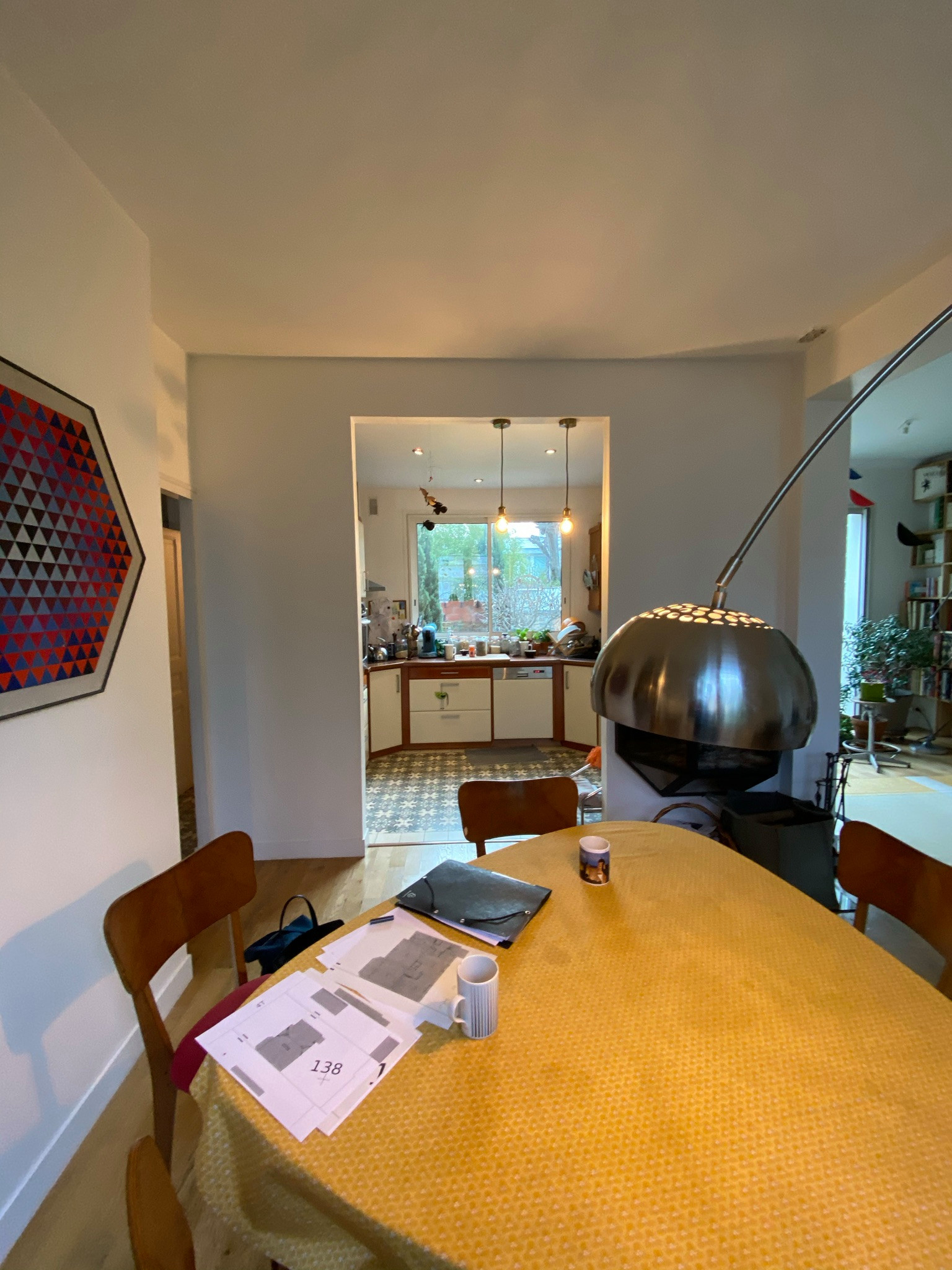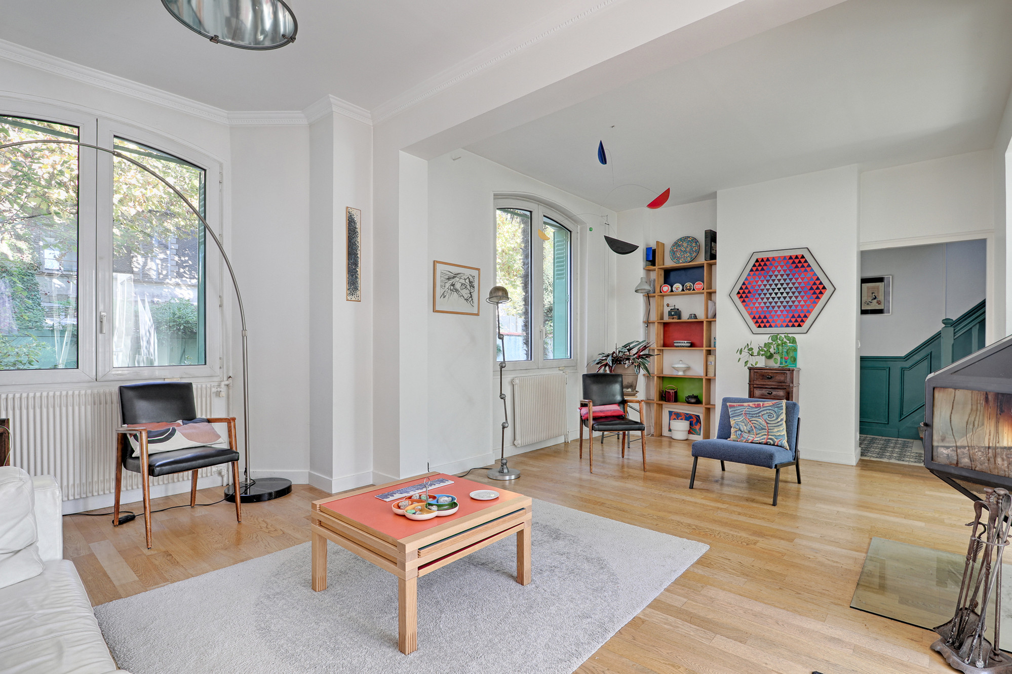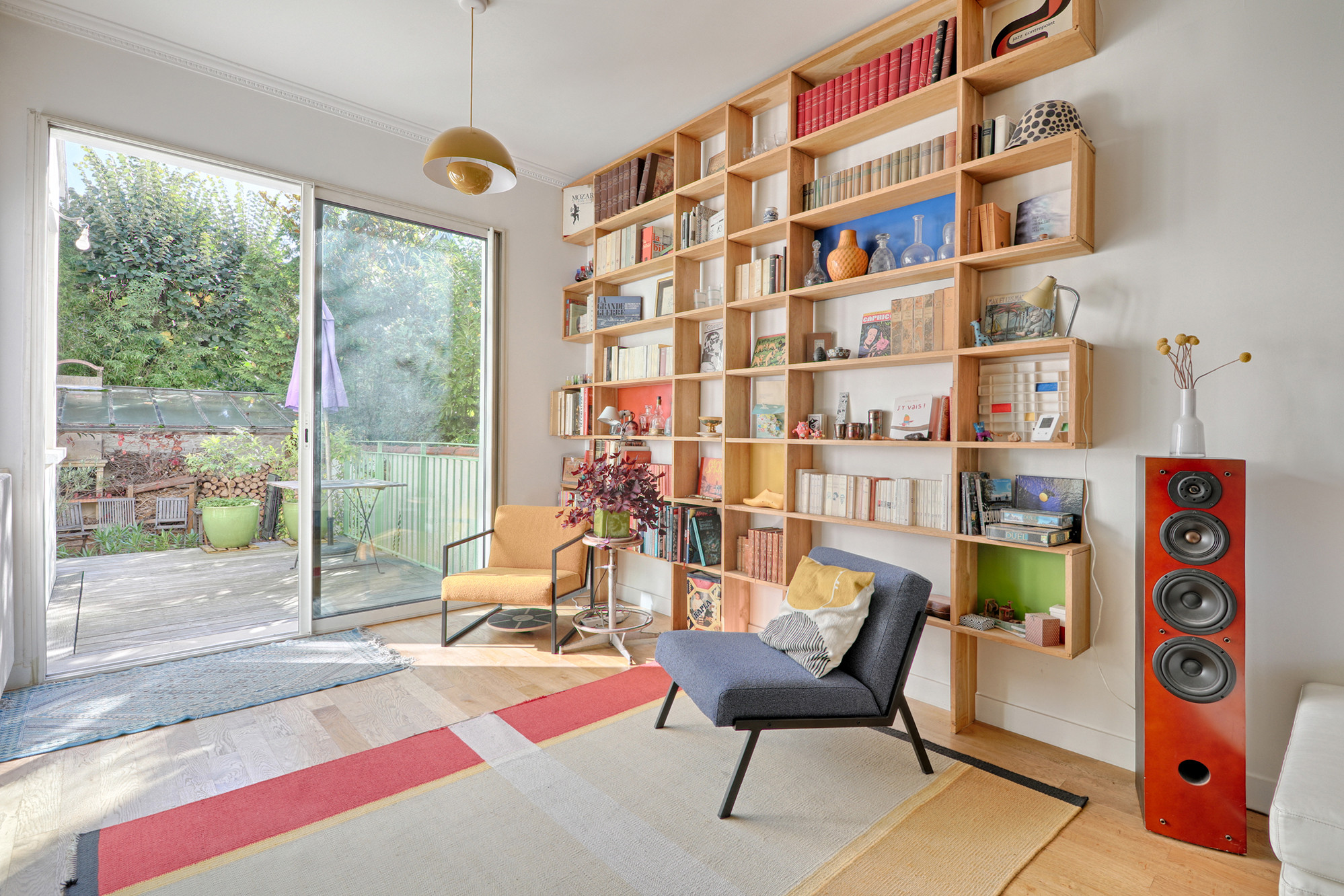 Après. Le séjour a été allégé de la table à manger après les travaux de l’extension de la cuisine. Il est désormais plus épuré. Sur la droite, le coin bibliothèque est resté à sa place.