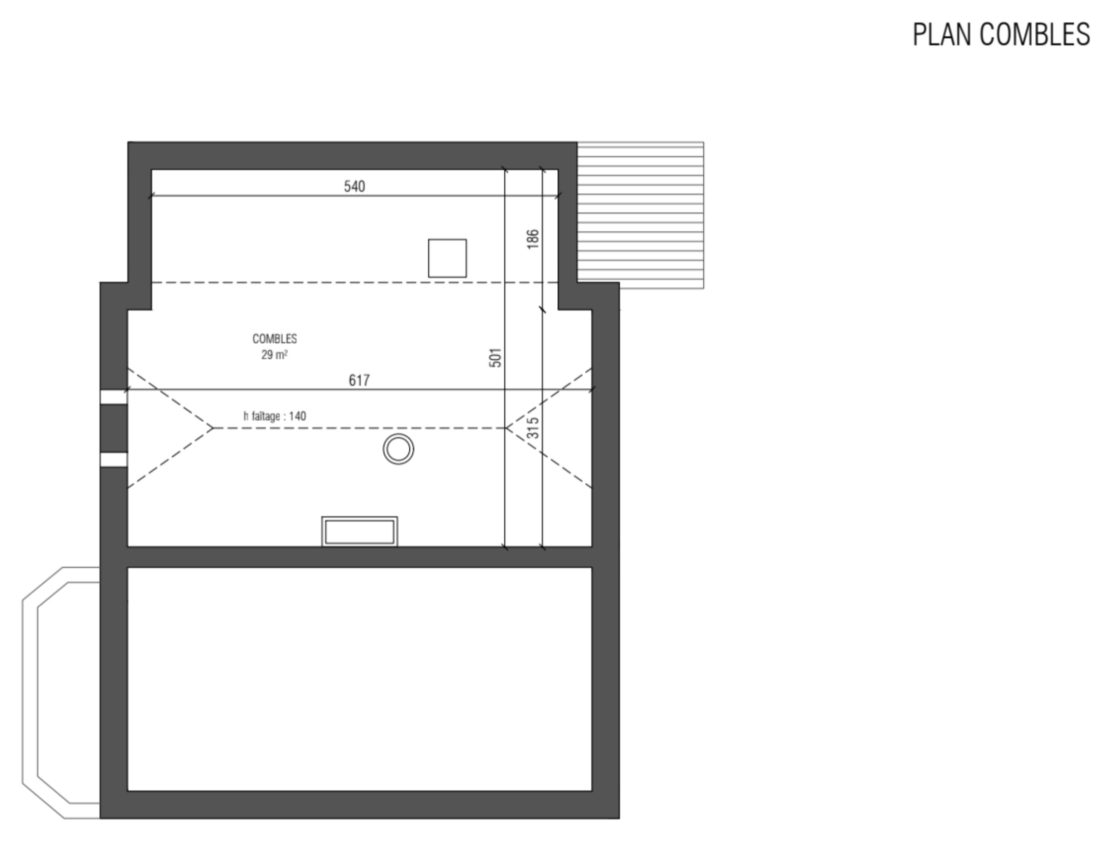 Avant. Voici le plan du 2ᵉ étage avant travaux. Si la maison comporte un sous-sol total, en revanche il n’avait pas de vrai grenier. « Lorsque je suis montée, j’ai eu beaucoup de mal à me déplacer car il n’y avait pas plus de 1,40 mètre de haut et le plancher de ce niveau formait une marche. Le sol était plus bas sur la partie de l’extension des années 1960 », explique Tina.