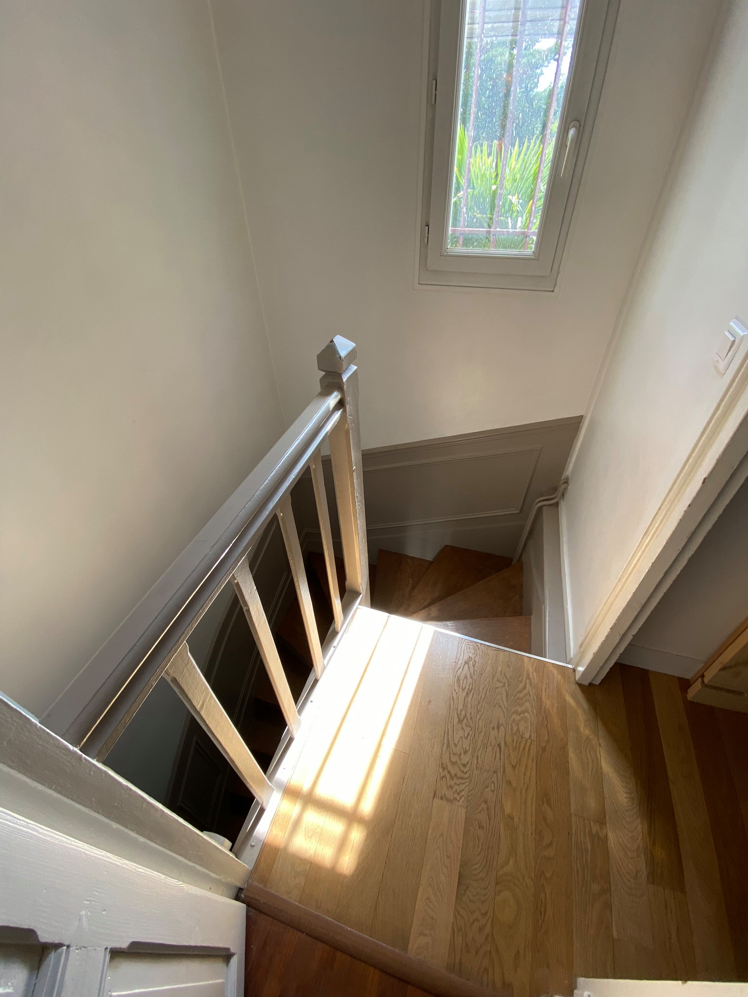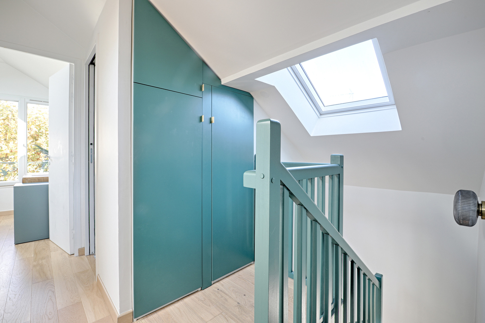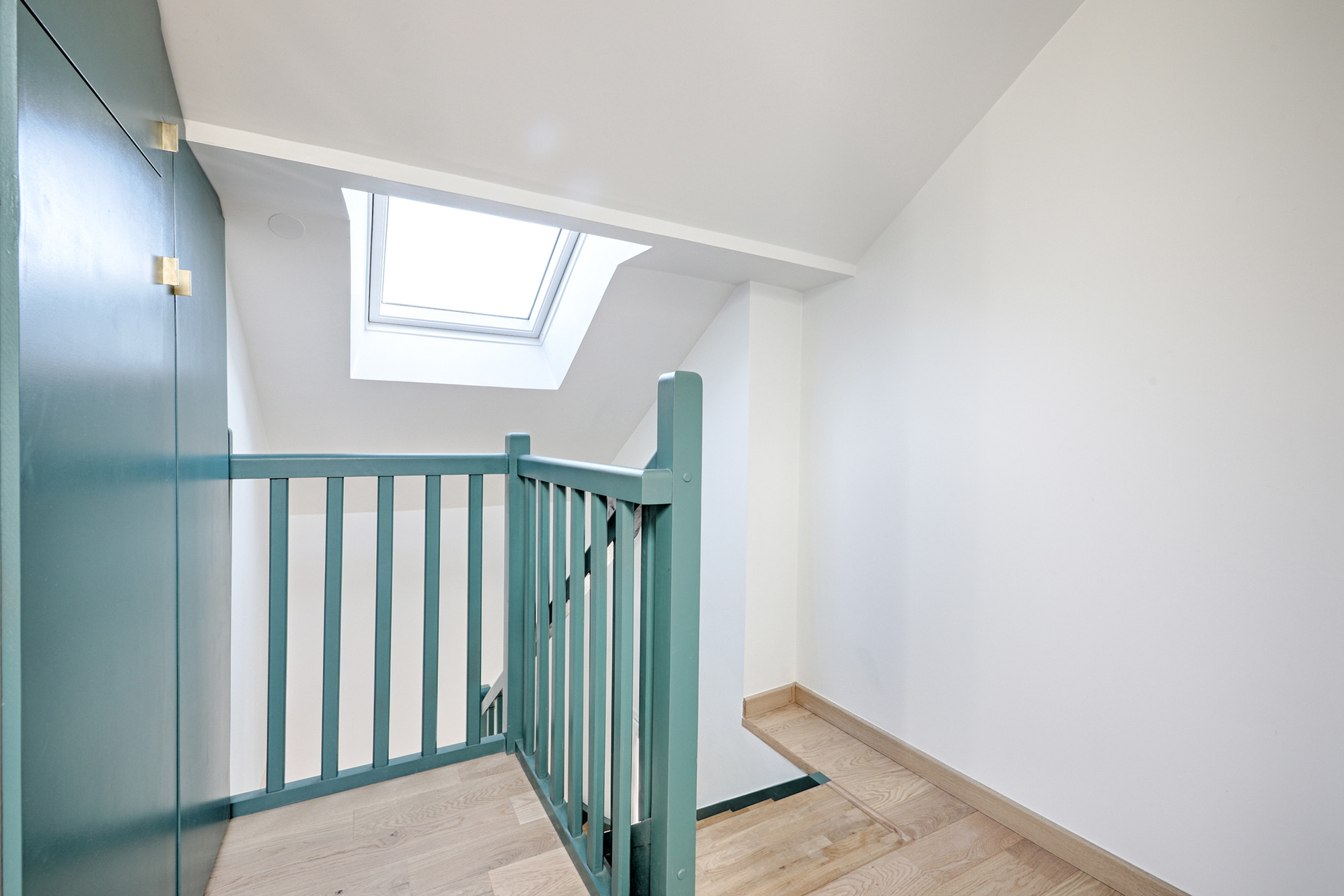 Après. Comme nous l’avons aperçu en bas, les garde-corps ont été repeints en vert. Le palier, à gauche de la photo, a été créé en réduisant la salle de bains. Sans cela, l’escalier vers le second niveau n’aurait pas été faisable.