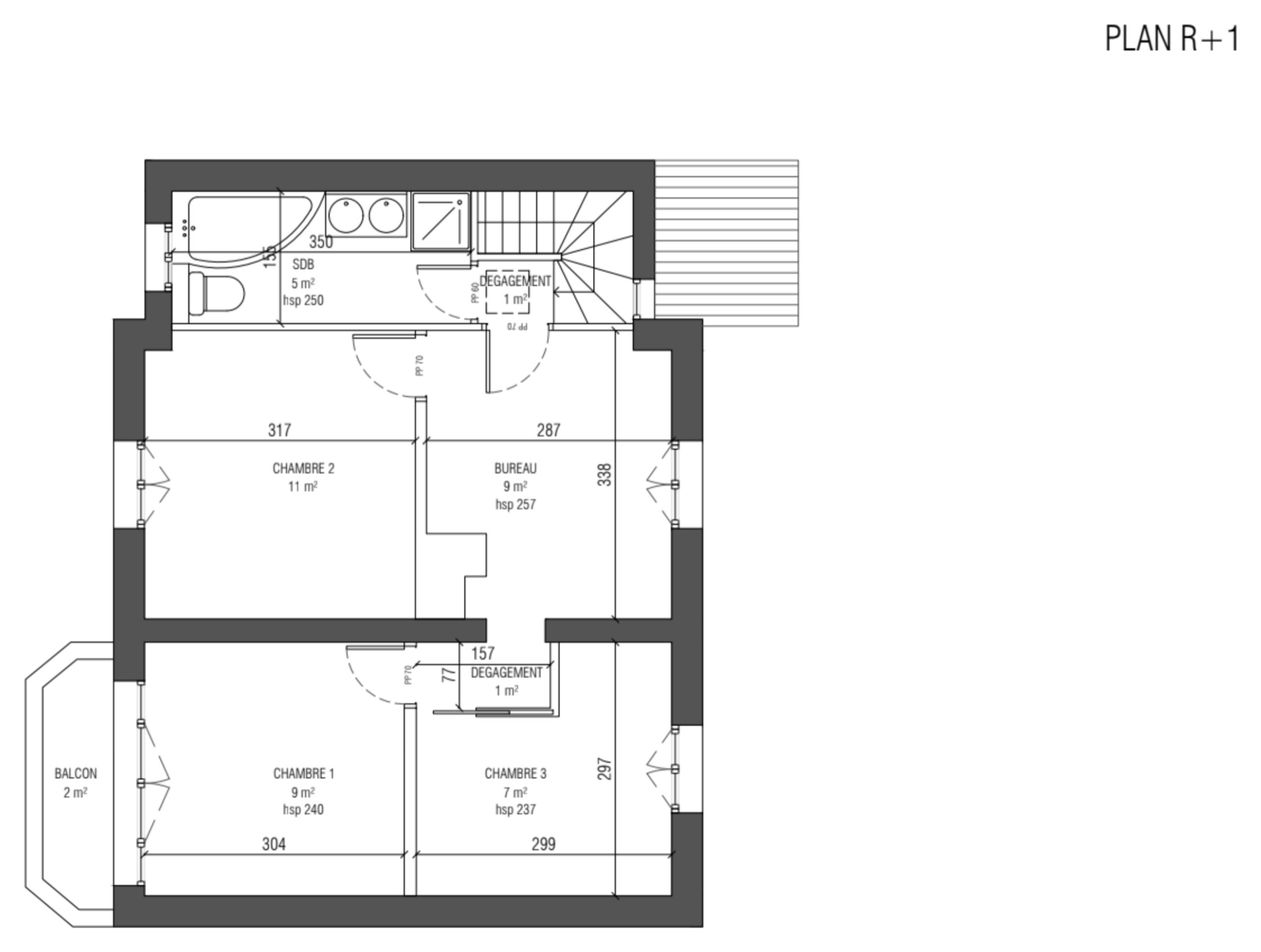 Avant. Le plan du 1er étage n’était pas classique. Depuis l’escalier occupant un coin du niveau, on accédait à un palier desservant la salle de bains, puis une petite pièce faisant office de bureau. De là, on entrait dans une première chambre sur rue, attribuée à l’aînée (chambre 2). Un dégagement menait ensuite à la toute petite chambre 3 de la cadette, qui permettait d’accéder enfin à la chambre parentale (chambre 1).
